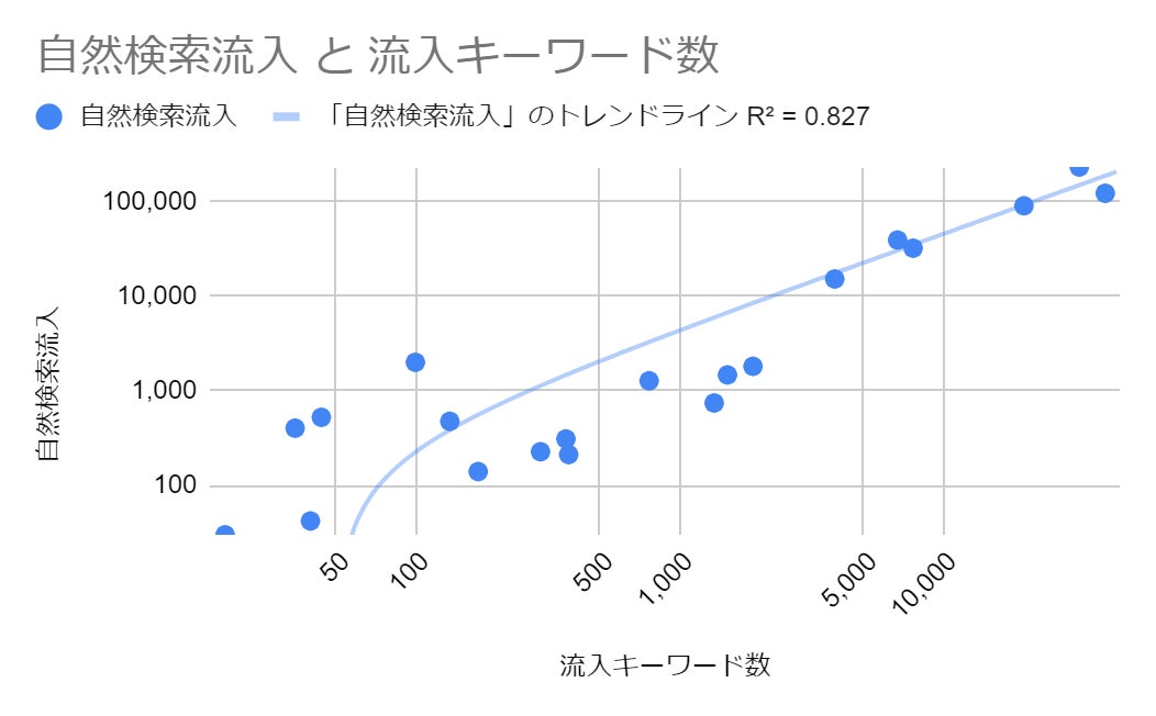 以下は、Ahrefsを使用し、セールステック(SFA)業界20サイトの自然検索流入数および流入キーワード数を調査した結果数値を散布図にしたものです。相関係数は0.91、決定係数は0.827と強い相関を示すものでした。これはブランドや指名流入の割合が必ずしも高くないことを示唆していると考えられます。