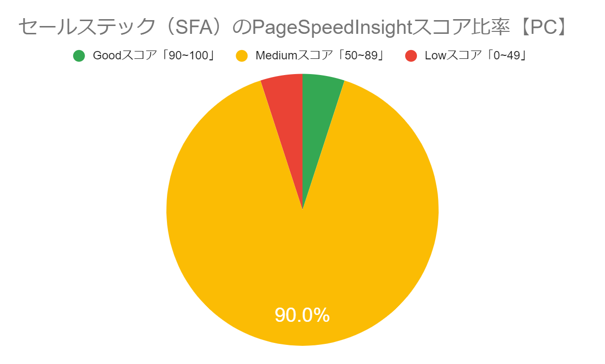 以下は、PageSpeed InsightsのAPIを使用し、セールステック(SFA)業界20サイトについて調査した結果です。黄色で表示されるMediumスコアの比率が90.0%と圧倒的な割合となっており、赤色で表示されるLowスコアが、ページスピードの改善がほぼ必要ないGoodスコアがともに5.0%という結果でした。