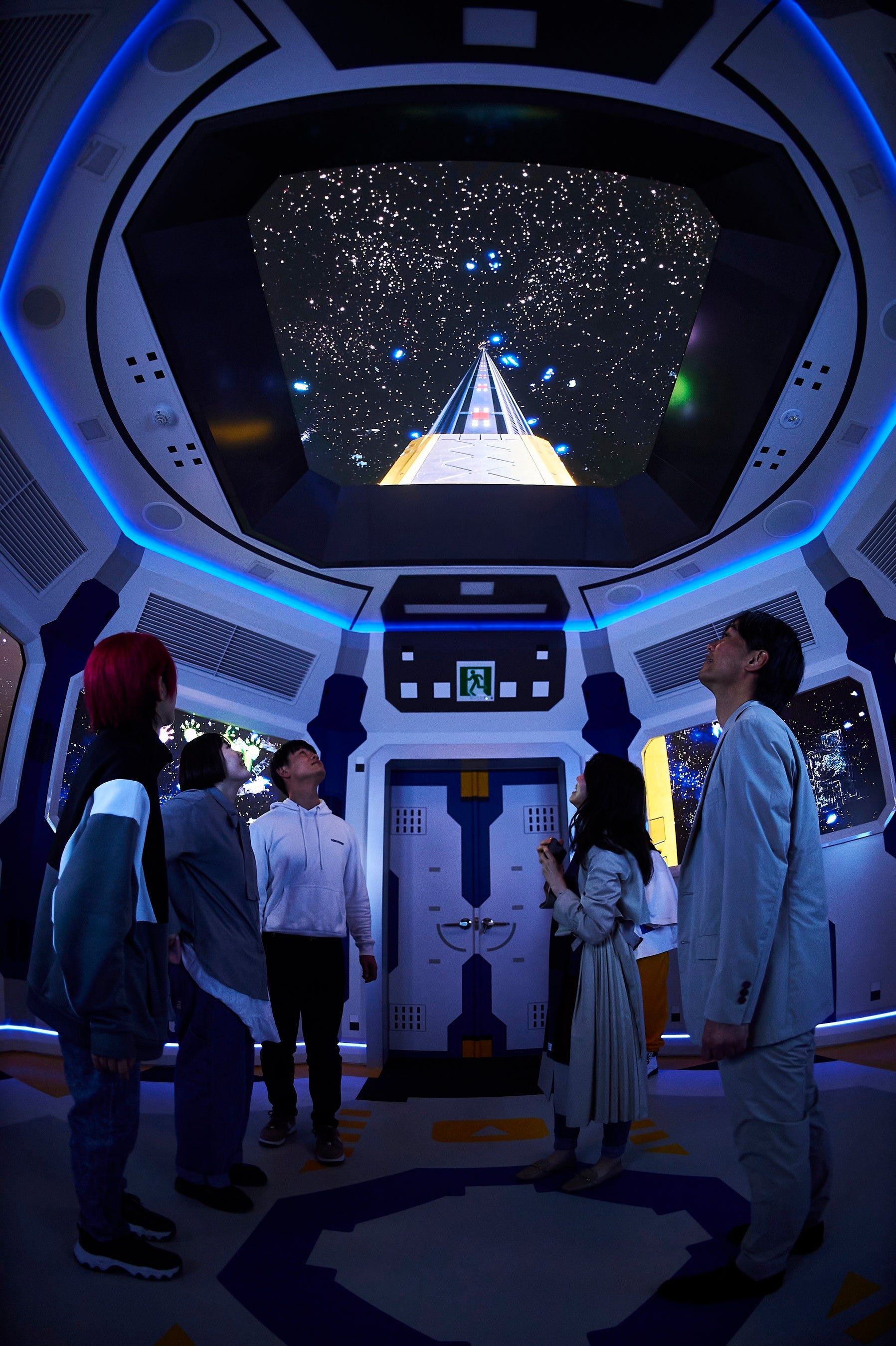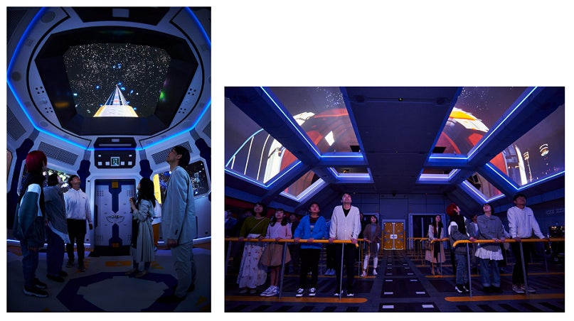 本パビリオンの床面にはソニーの触覚提示技術(ハプティクス)を活用した「Haptic Floor」を設置しています。高精細な新作映像や音響と合わせて、ハプティクスによる振動の演出が体感できます。例えば軌道エレベーターに搭乗するシーンでは耳で聞こえたエレベーターの機械音に合わせて足元からはその振動が伝わってくる迫力ある没入体験を提供します。