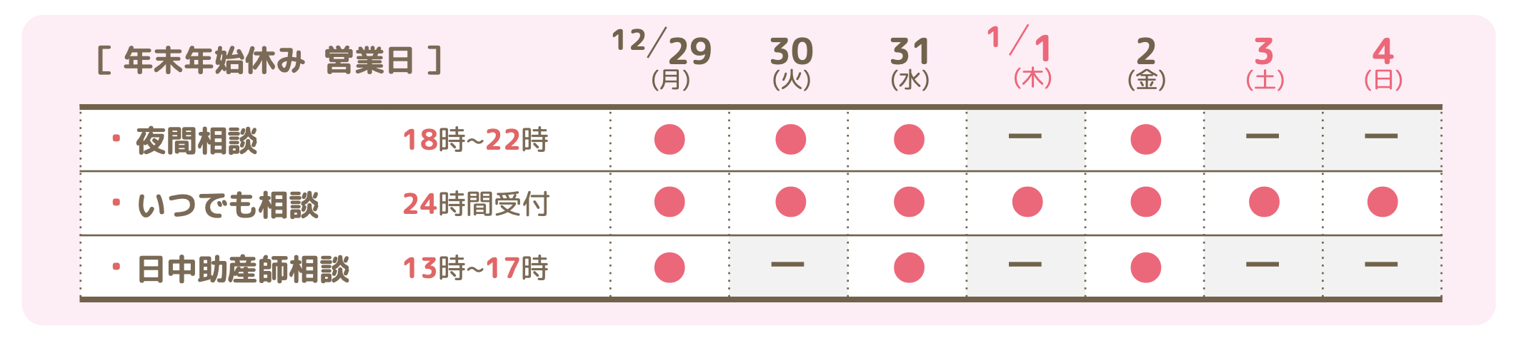 日中助産師相談 (月・水・金曜日 13時〜17時):12/29(月)、12/31(水)、1/2(金)