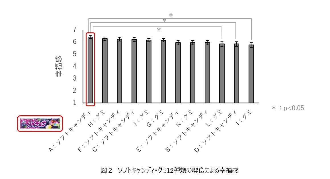 ソフトキャンディまたはグミを食べた時に感じたオノマトペ(さくさく、ふんわり等の擬音語・擬態語)や幸福感の高さを調査し、オノマトペを感性(楽しい、落ち着いた等の印象)に変換するシステムを活用して、AI(機械学習)解析により、幸福感と感性の関係を導き出しました。研究の結果、ハイチュウは類似の他のソフトキャンディやグミと比較して幸福感が高いこと、また、ソフトキャンディとグミは、幸福感に関係する感性(食べた時の印象)が異なる事が明らかになりました。