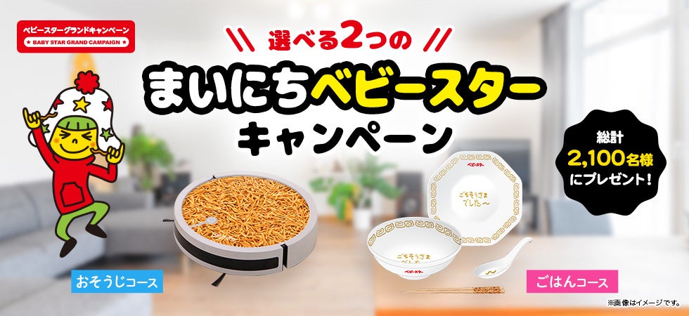 ユニークなベビースターグッズでファンを虜にしてきたベビースターのプレゼントキャンペーン。2022年8月よりスタートする新キャンペーンは、毎日のおそうじの相棒になってくれそうなロボット掃除機「ベビースータロー」か、ラーメン定食気分を楽しめる食器セットの選べる2コース。面白グッズでワクワクするベビースター生活を一緒に楽しみませんか。
