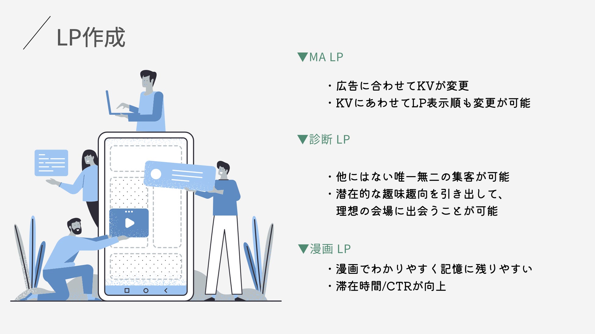 | 60%以上の女性が週に会は漫画を呼んでいると言われている昨今。 よりわかりやすく、記憶に残りやすい漫画LPでサービスの理解を深め、CTRの向上、購買意欲に繋げることが可能に! |