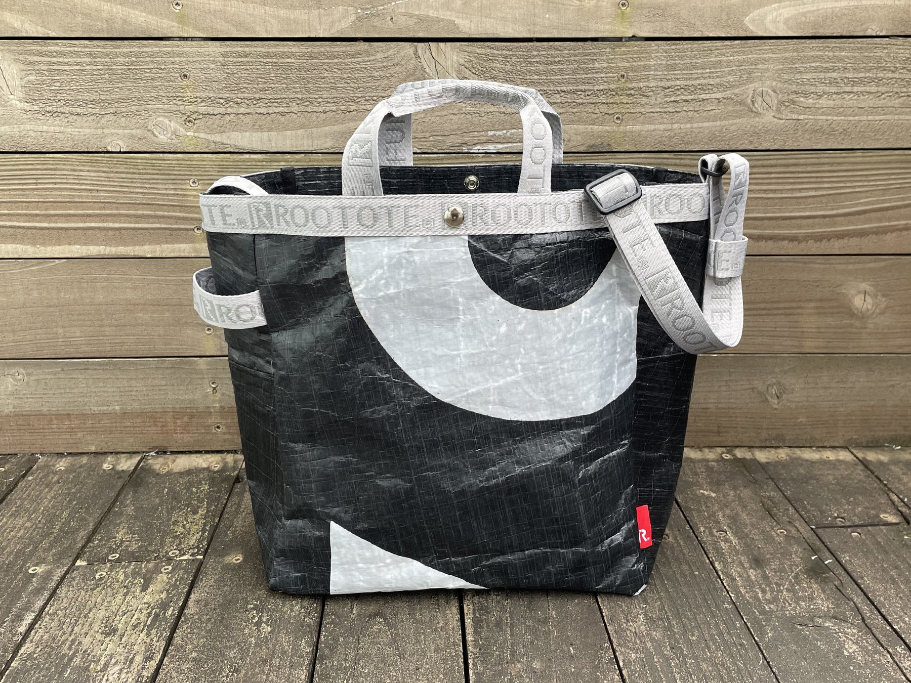 ミニマルタイプのトート。左右のハトメにお持ちのショルダーを取り付ければショルダーバッグに。背面に大きなルーポケット付き。ハンドルなどに使用しているテープの色・柄も様々。ROOTOTEで保管してきた、デザイン検討の過程で生じた残テープを使用しています。