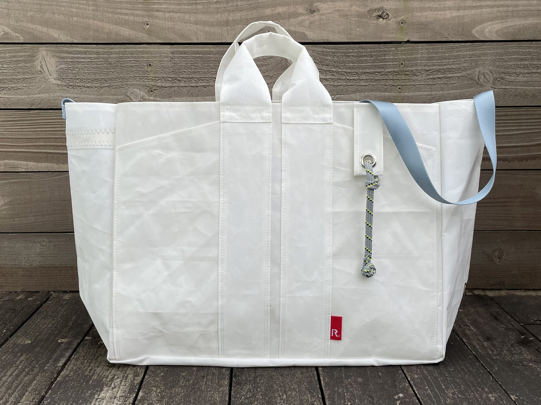 RT.デリ.ワイド.RESAIL 16,500円(0422 01 アソート)サイズ:W37×H22×D14cm 持ち手25cm ソフトシャックル20cm 素材:使用済みヨットセイル生地(ポリエステル) ポケット:外側2箇所(2022年9月発売)