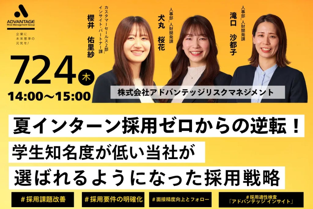 株式会社アドバンテッジリスクマネジメントは、2025年7月24日(木)に経営者様・戦略人事部門・採用人事部門のご担当者様/責任者様・採用業務に携わる方を対象としたWebセミナー「夏インターン採用ゼロからの逆転!学生知名度が低い当社が選ばれるようになった採用戦略」を開催いたします。