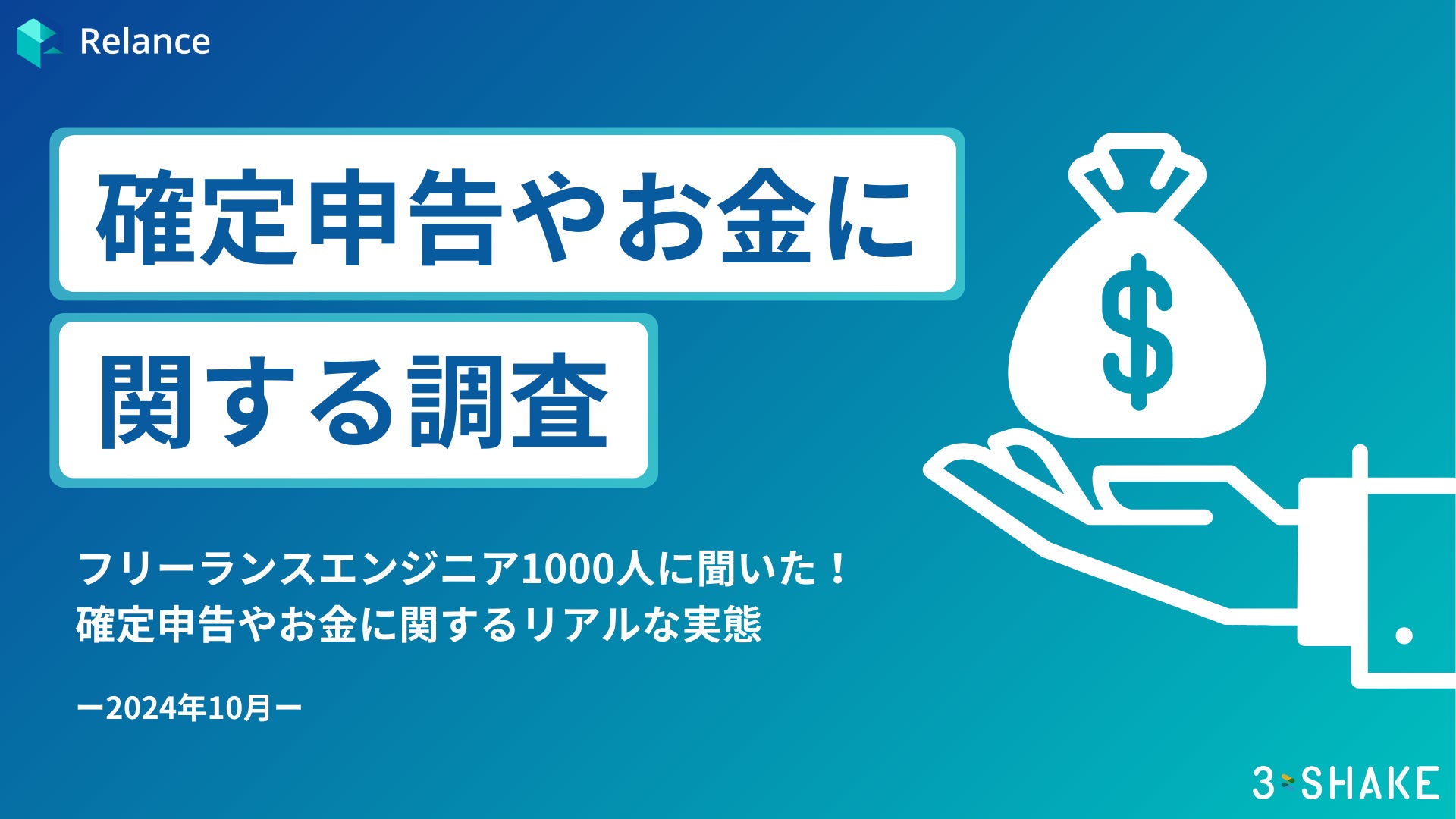 フリーランスのITエンジニア向け案件紹介サービス「Relance(リランス)」を運営する、株式会社スリーシェイク(本社:東京都新宿区、代表取締役社長:吉田 拓真、以下スリーシェイク)は、フリーランスエンジニア約1,000名を対象に、確定申告やお金に関する調査を行いました。