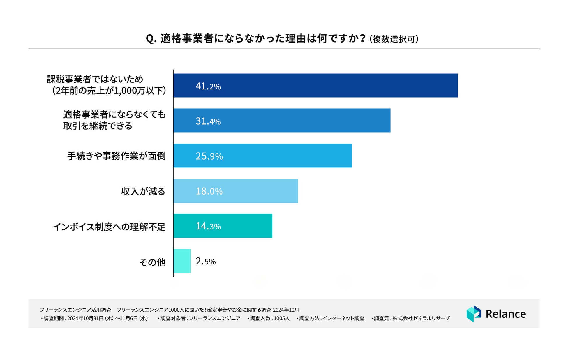 適格事業者にならなかった理由、「インボイス制度への理解不足」が14.3%と、インボイス制度の複雑さやわかりづらさが今後も課題か