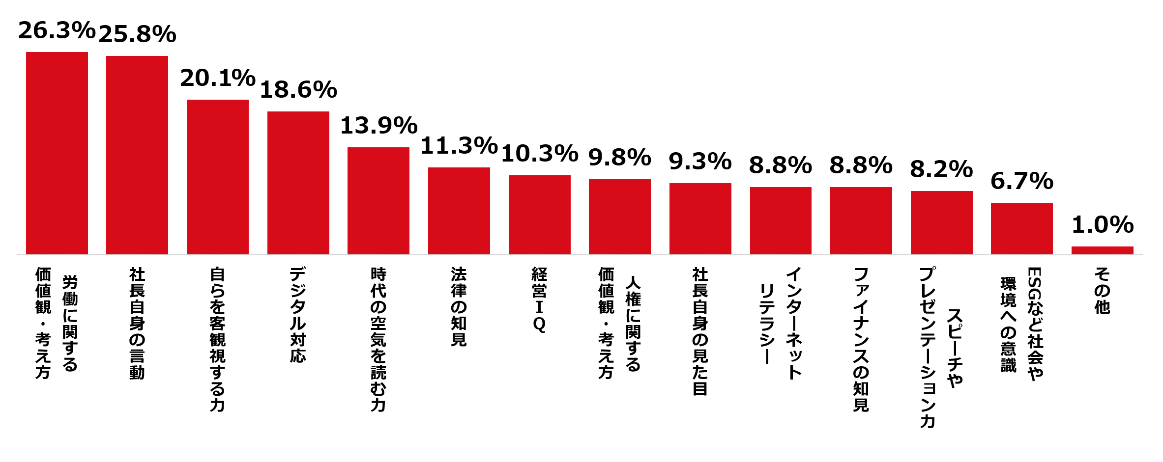 ●社長にアップデートしてほしいこと、「労働に関する価値観・考え方」26.3%、「社長自身の言動」25.8%、「自らを客観視する力」20.1%