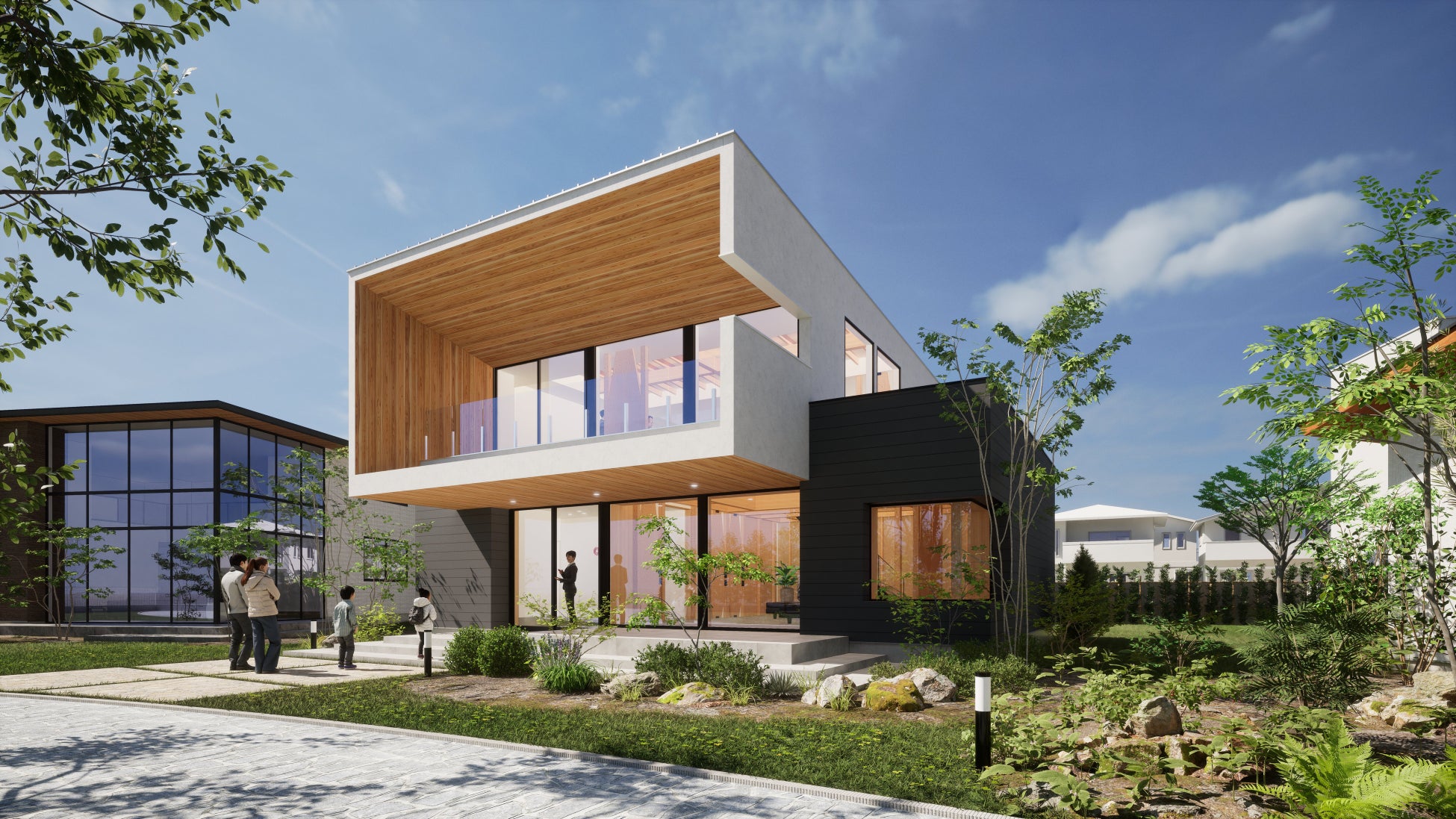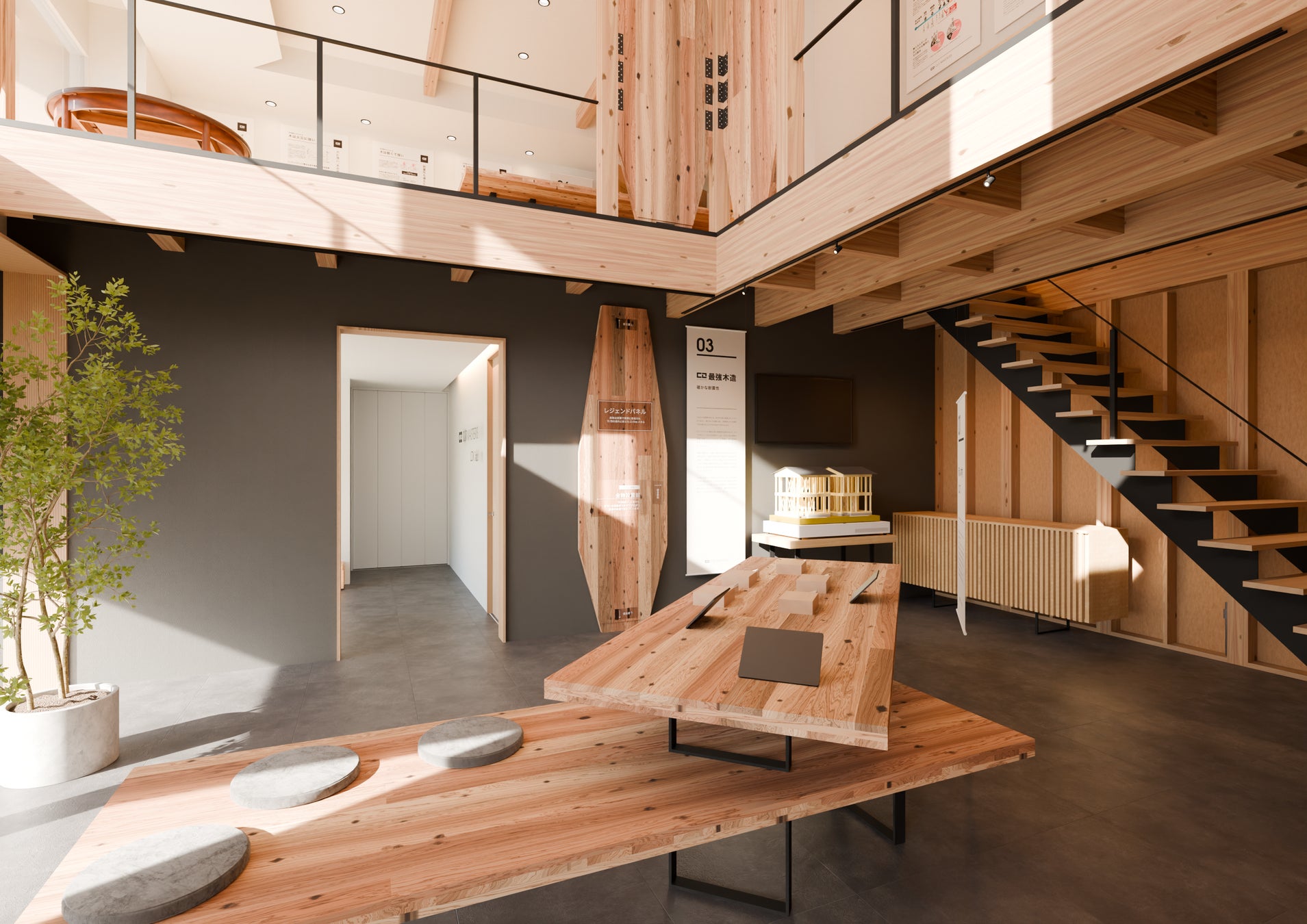 本ショールームは、2024年10月に販売開始した新しい住宅商品「CLT MASTERS(シーエルティ―マスターズ)」に採用している当社オリジナル開発の「CLTハイブリッド構法」によって建築しており、あえて構造躯体を一部現しにすることで、通常壁の中に隠れてしまう部分の展示を行います。