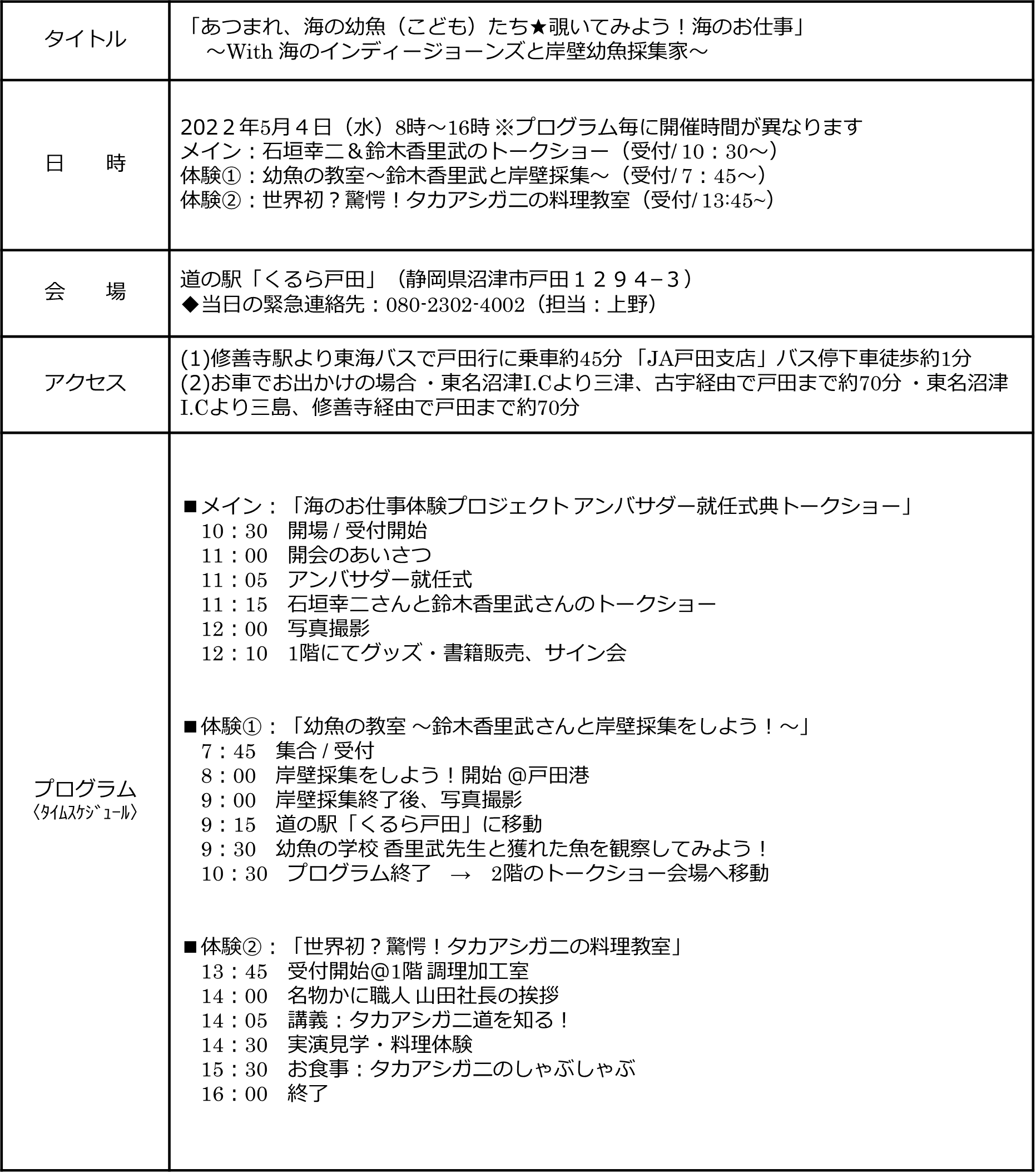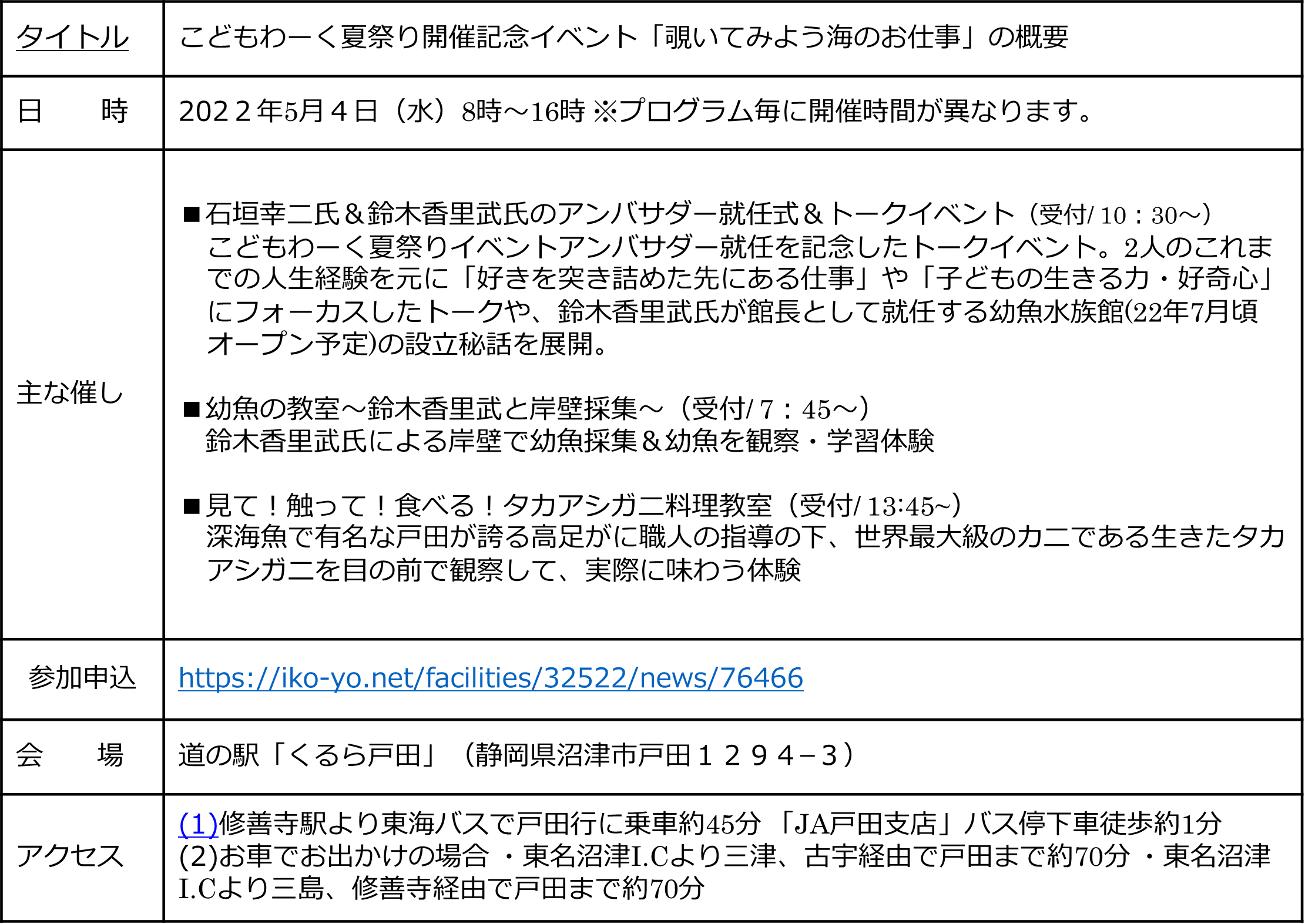 また5月4日には「こどもわーく夏祭り」開催を祝した記念イベント「覗いてみよう海のお仕事」を静岡県沼津市 道の駅くるら戸田で開催。同イベントでは、石垣幸二氏と鈴木香里武氏のアンバサダー就任式、両氏によるトークイベントを実施。更に鈴木香里武氏による幼魚採集体験や戸田名物タカアシガニの調理体験など、ここでしかできない貴重なプログラムを実施予定です。