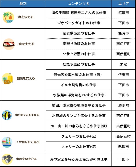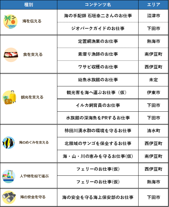 海に関わる6つのテーマに沿った全15本のお仕事体験を伊豆半島各地で実施します。