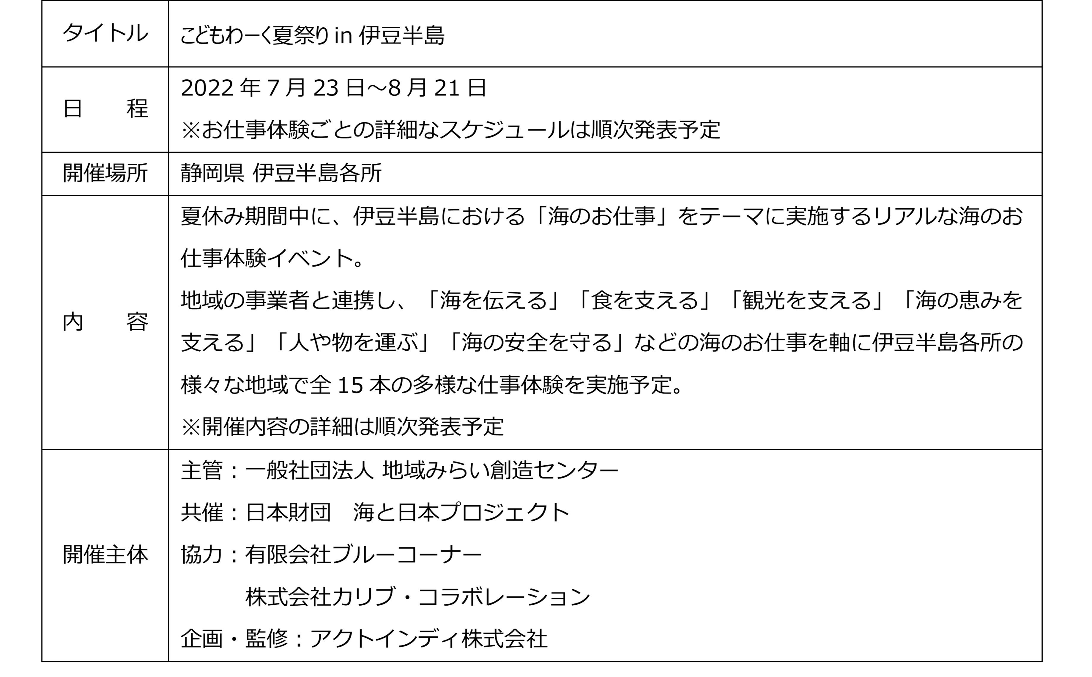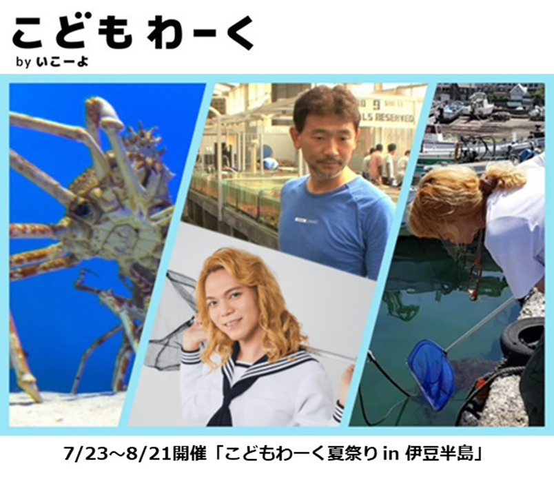 国内最大級の子どもとお出かけ情報サイト「いこーよ(https://iko-yo.net)」を運営するアクトインディ株式会社は、2022年7月23日~8月21日の期間、小学生向けの海のお仕事体験イベント「こどもわーく夏祭りin伊豆半島」(以下、こどもわーく夏祭り)を企画・実施します。イベントアンバサダーとして伊豆半島にも関わりが深くテレビ等でもお馴染みの海の手配師こと石垣幸二氏と幼魚岸壁採集家の鈴木香里武氏が就任。自らもお仕事体験を主宰するなど「こどもわーく夏祭り」を盛り上げます。