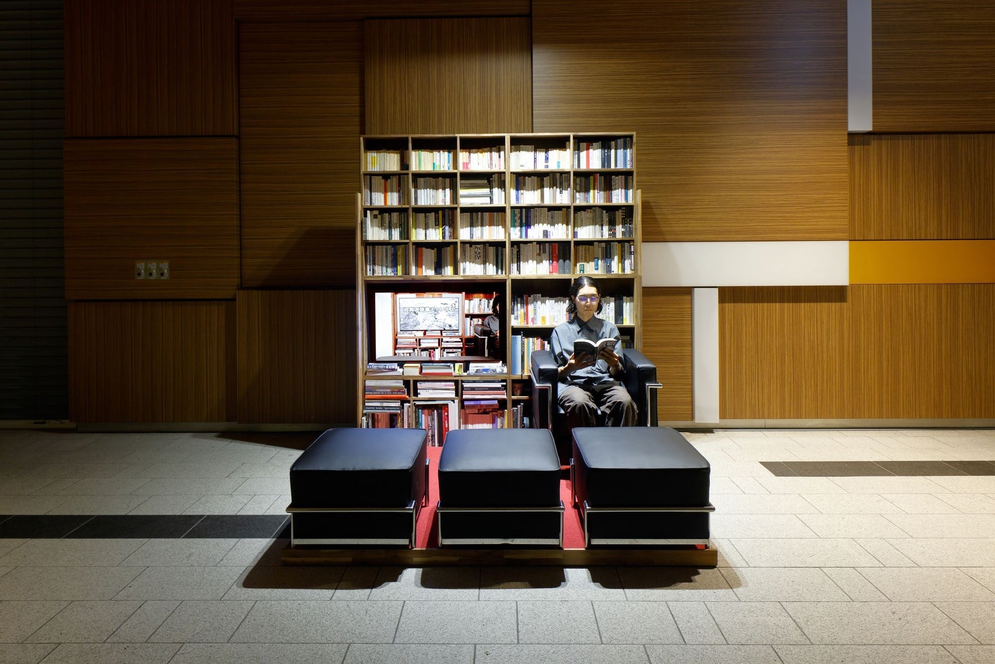 本作は「個人と作品のあいだにある距離」をテーマに、延々と読書と休憩を続けるパフォーマー、映像、書籍、来場者によって構成される。鑑賞行為には、それを行う個人と作品とのあいだに、常に先行して存在する鑑賞者が含まれているように思える。ここではそのような存在の集合である「鑑賞共同体」と呼べるものを視覚化し、鑑賞行為の過程に本作品のような空間が林立して、無限に列をなしているのではないかという推測を示す。