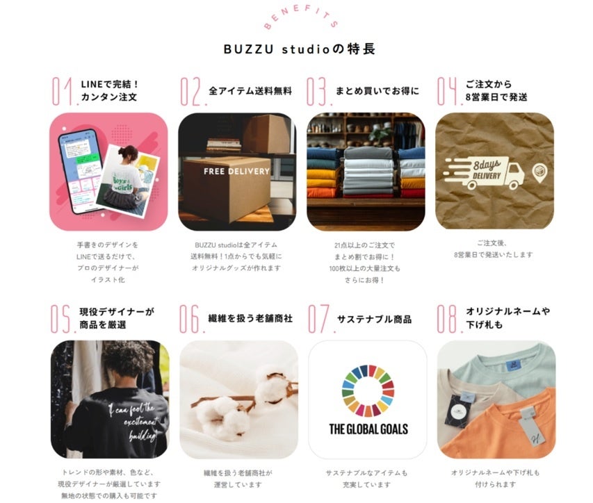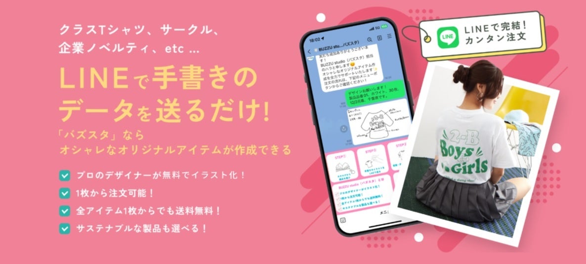 バズスタはLINEを通して手書きのデータを送るだけでプロのデザイナーが無料でイラストに仕上げ、そのイラストを使用したアイテムを簡単に作ることができるサービスです。学園祭や運動会シーンでのクラスTシャツや、大学生の方々のサークルアイテム、企業ノベルティなど、様々な場面でオリジナルアイテムが必要となる場面がありますが、おしゃれなイラストやデザインを作ることに対して苦手意識をもつ方もいる中、本サービスを活用いただくことで、プロがデザインしたおしゃれなイラストで簡単にオリジナルアイテムを制作することができます。