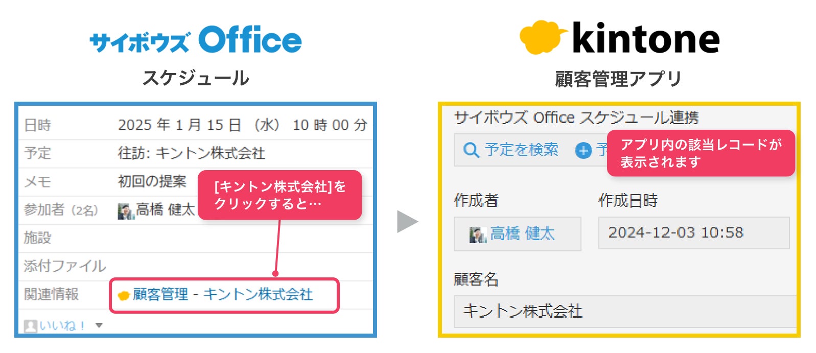 「サイボウズ Office」のスケジュールから「kinotone」アプリを表示する機能です。訪問予定のスケジュール詳細画面の「関連情報」欄に、顧客管理アプリの訪問先情報へのリンクが表示されます。リンクをクリックすると、「kintone」のレコード詳細画面が開き、顧客情報を確認することができます。