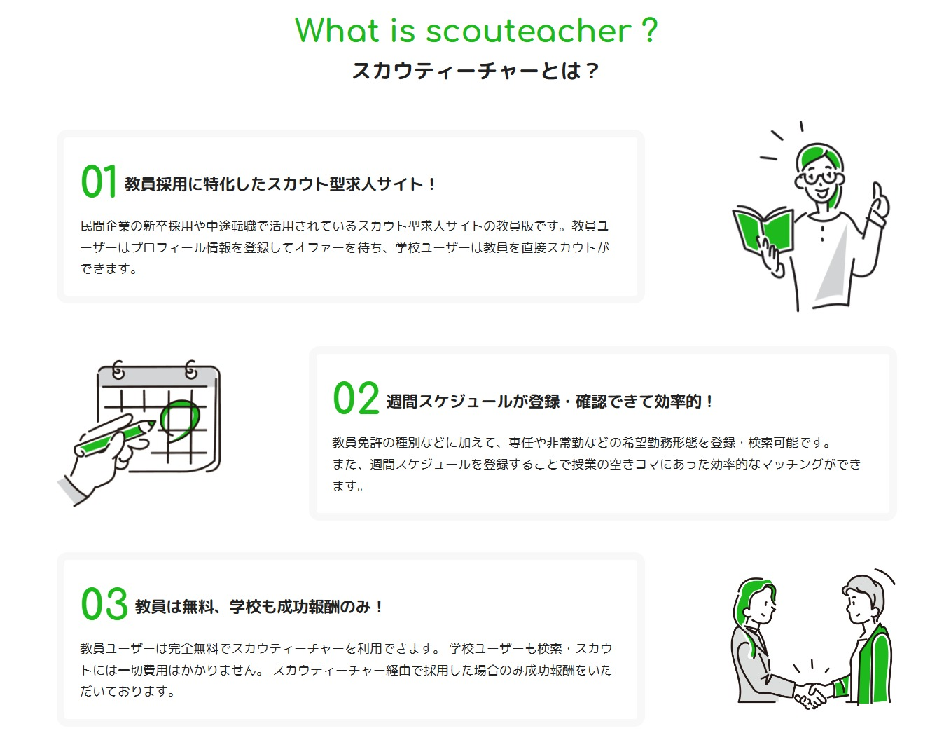 スカウティーチャーは、教員採用に特化したスカウト型求人サイトです。民間企業で広く活用されている新卒採用や中途採用のスカウト型求人サイトの教員版として、人材紹介エージェントを介さずに、教員を探している学校と教職を希望する教員が直接ウェブサイト上でのコミュニケーションがおこなえるように設計されています。