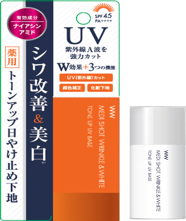 肌の老化の原因は紫外線によるものが80%を占め、また、紫外線A波はシワの原因のひとつとされています。『薬用メディショット トーンアップ日やけ止め下地」は、SPF45 PA++++で紫外線による光老化を徹底的に防ぎます。そして、シワ改善の有効成分「ナイアシンアミド」が、できてしまった深いシワやシミもケアするので、複合的な肌悩みを抱える世代にはうれしい商品です。