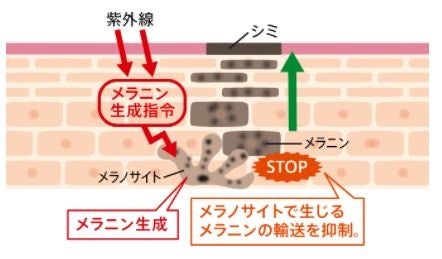 メラニンは外部刺激から肌を守る役割を担っていますが、過剰に生成され蓄積するとシミになります。ナイアシンアミドは、メラニンの輸送を抑制することで、シミの発生を予防する美白効果があります。