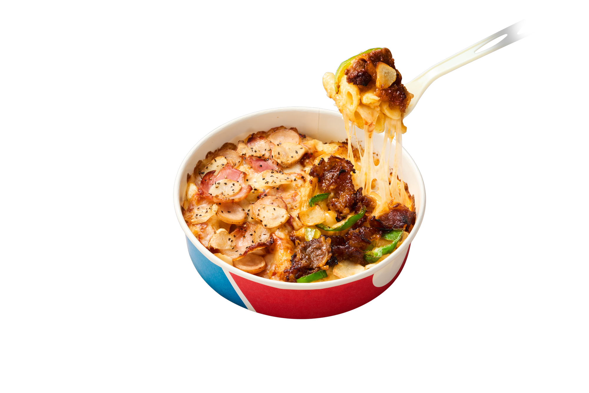 「ピザパスタボウル」は、ペンネでピザが楽しめる、ドミノ・ピザでしか味わうことができない新感覚で斬新な新商品です。ピザとベストな組み合わせになるようパスタの種類を試行錯誤し、弾力がありつつも歯切れが良く、肉厚でソースとも絡みやすい、表面に溝のあるペンネを使用することで、モッツァレラチーズとピザとトッピングの旨みを存分にお楽しみいただける商品に仕上げました。パスタのようでパスタではない、グラタンのようでグラタンではない、ペンネにピザのトッピングとチーズがたっぷりと絡んだ味わいは、まさにピザとペンネのおいしさが融合した新感覚ピザの味わいです。さらに、1つの商品で2つの味が楽しめるピザパスタボウルのハーフ&ハーフもご用意しました。単品7種類、ハーフ&ハーフ4種類の計11種類の展開です。