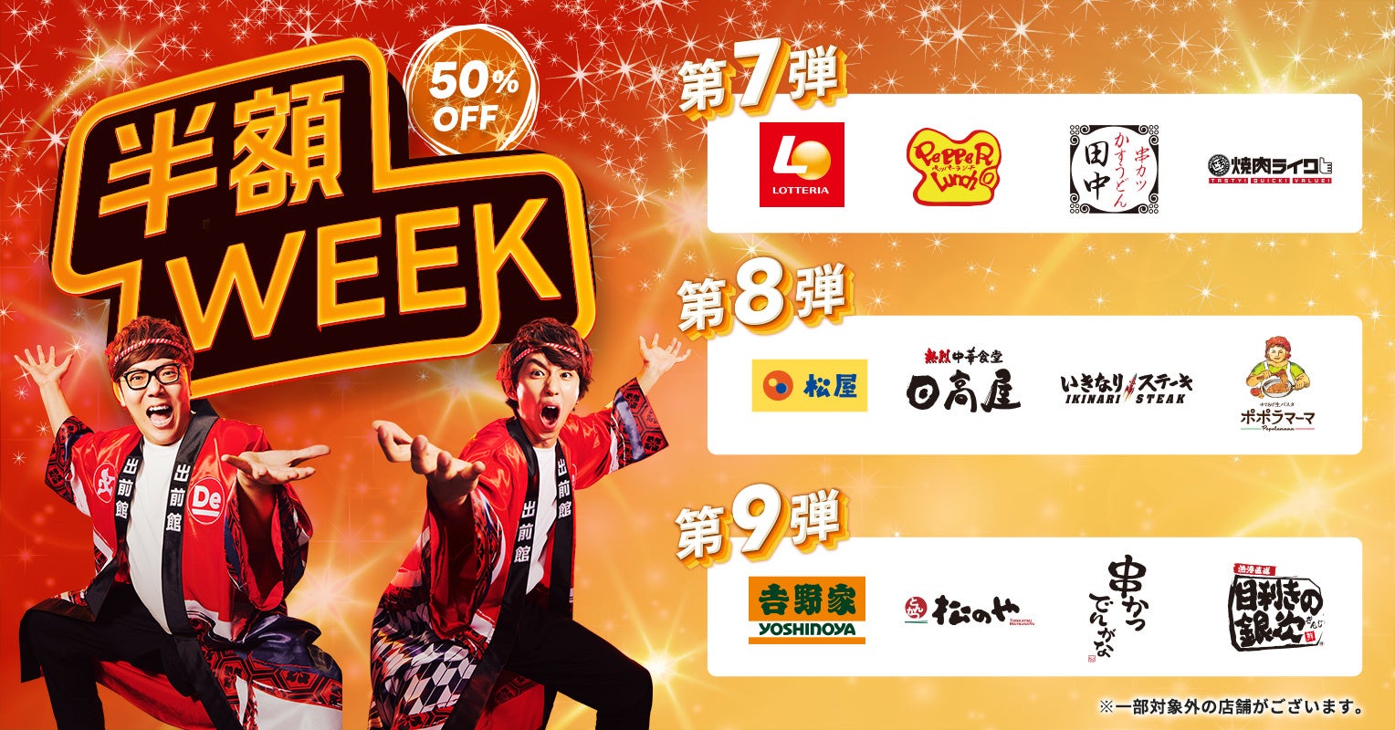 日本最大級の出前サービス『出前館』(運営:株式会社出前館)は、本日より開催する「週替わり半額WEEK」 の第7弾~第9弾の対象店舗が決定したことをお知らせいたします。