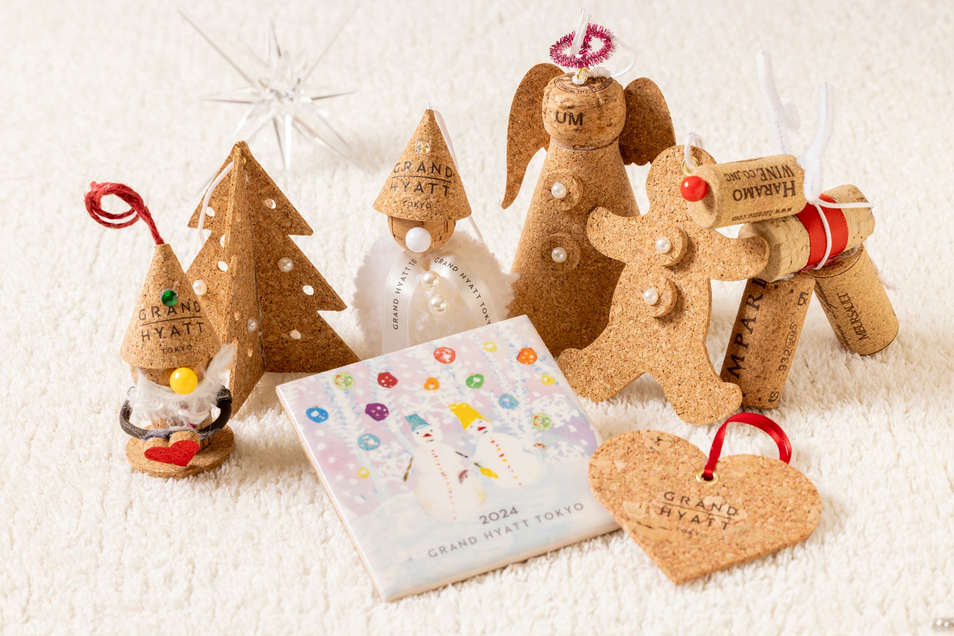 ホテル内で消費されたワインやシャンパンのコルク栓をアップサイクルし、障がいのある方たちが一つひとつ手作りするサンタクロースや天使、トナカイの形をしたオーナメントと、子どもたちが描く絵をモチーフにした今年のテーマ「Love for Our Future」のデザインを施したイヤータイルを数量限定でご用意いたします。福祉施設で働く障がいのある方々によるハンドメイドのオーナメントは、心のこもったクリスマスプレゼントにも最適です。売上金のすべてをNPO法人「子供地球基金」に寄付いたします。