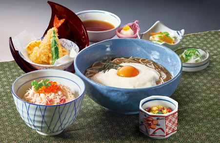 とろろと卵黄を“お月見”に見立てた「月見そば」に本ズワイがにたっぷりのミニ丼・天ぷら・小鉢がついた和膳。