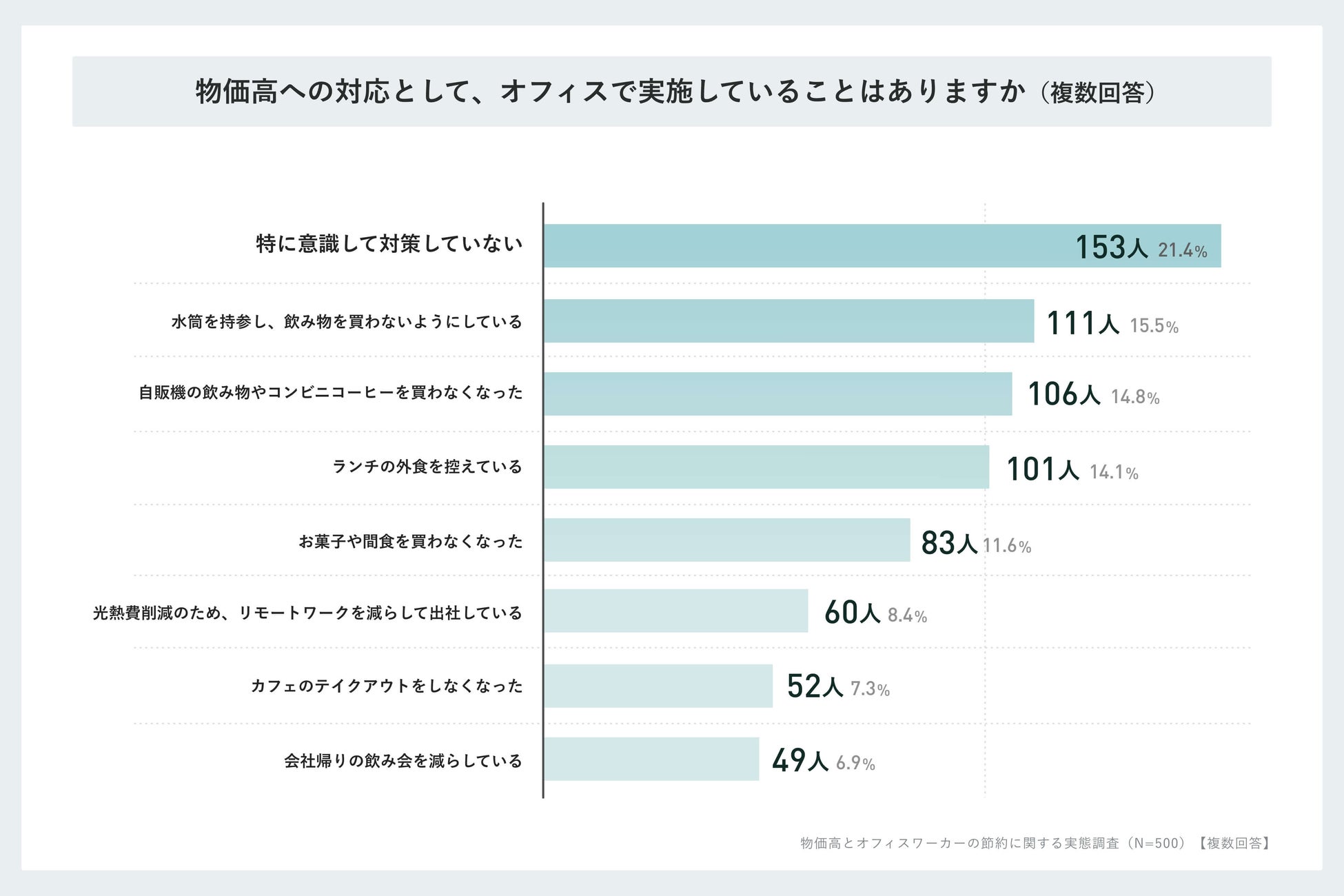 オフィス内での物価高への対応として、最も多かった回答は「特に意識して対策していない」で153人でした。具体的な行動としては「水筒を持参し、飲み物を買わないようにしている」が111人、「自販機の飲み物やコンビニコーヒーを買わなくなった」が106人、「ランチの外食を控えている」が101人と続きました。