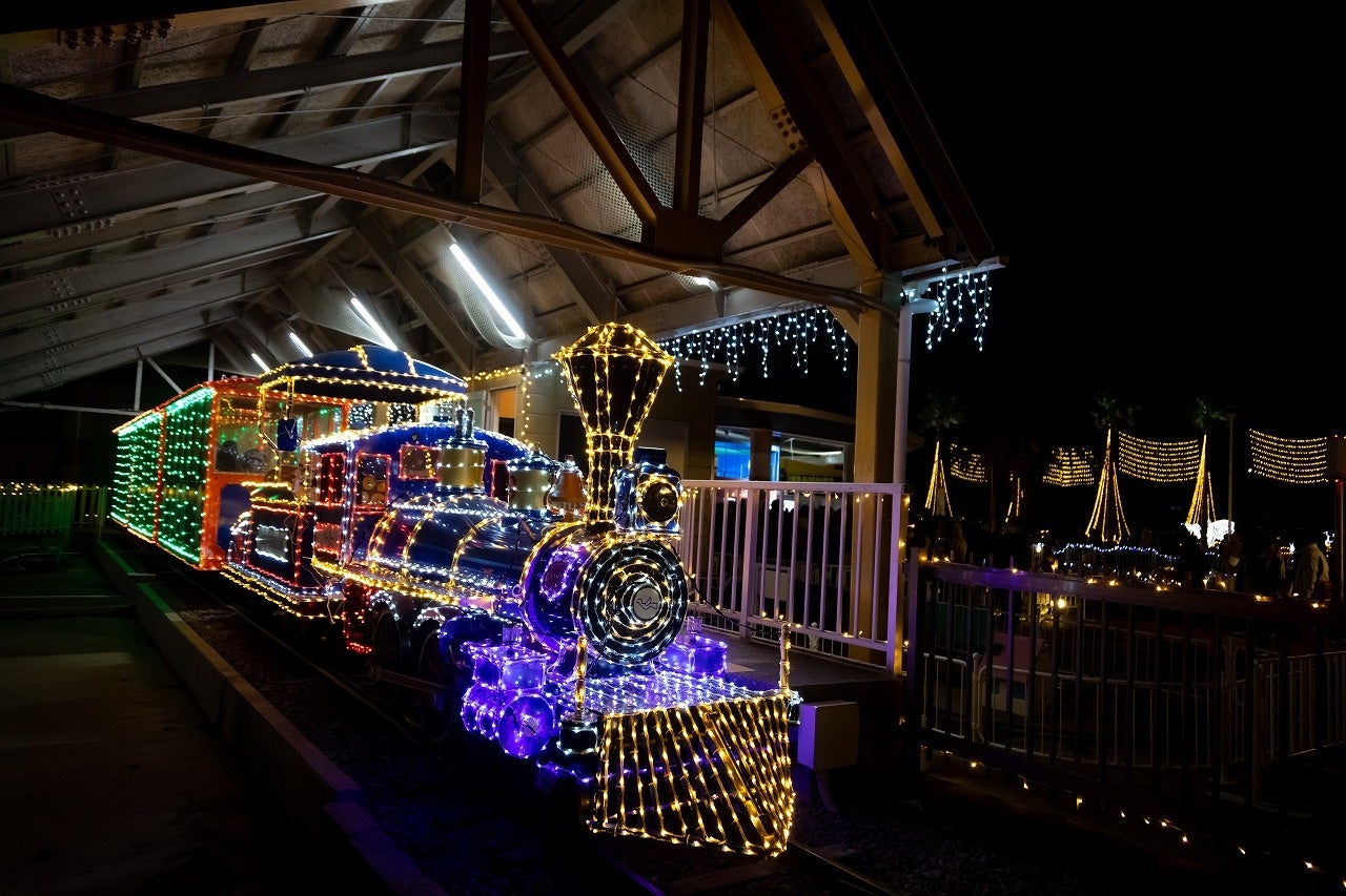 ヤシの木のライトアップ、動物のイルミネーションや、七色に輝くシャボン玉マシーンなどが登場し、賑やかに彩ります。ゴーカートやSL機関車など、期間限定の光る遊具がたくさん登場するヒカリノ遊園地も子供たちに大人気!