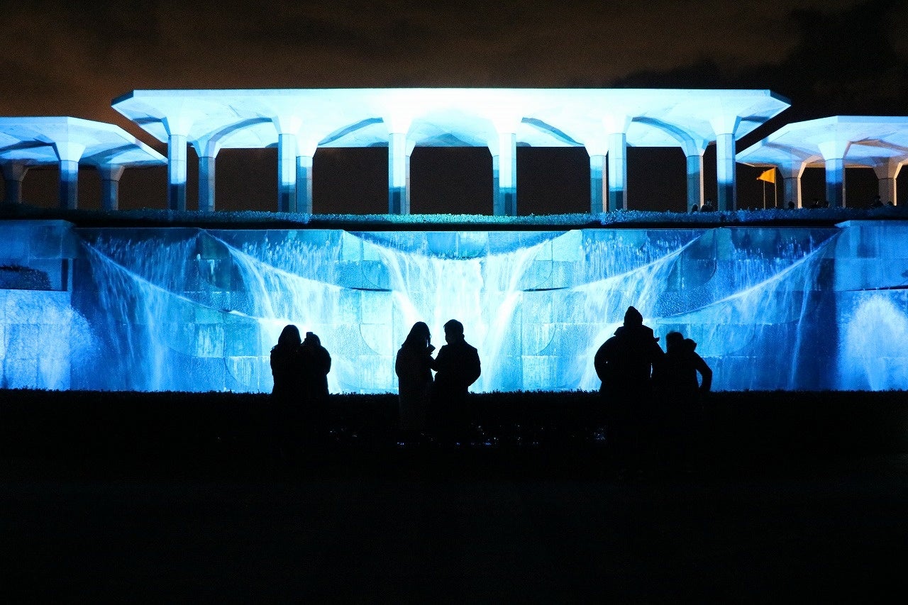 西口からまっすぐ伸びる全長100mのカナールと、その先につながる噴水までを幻想的にライトアップ。噴水をキャンドルに見立てた演出は必見です。