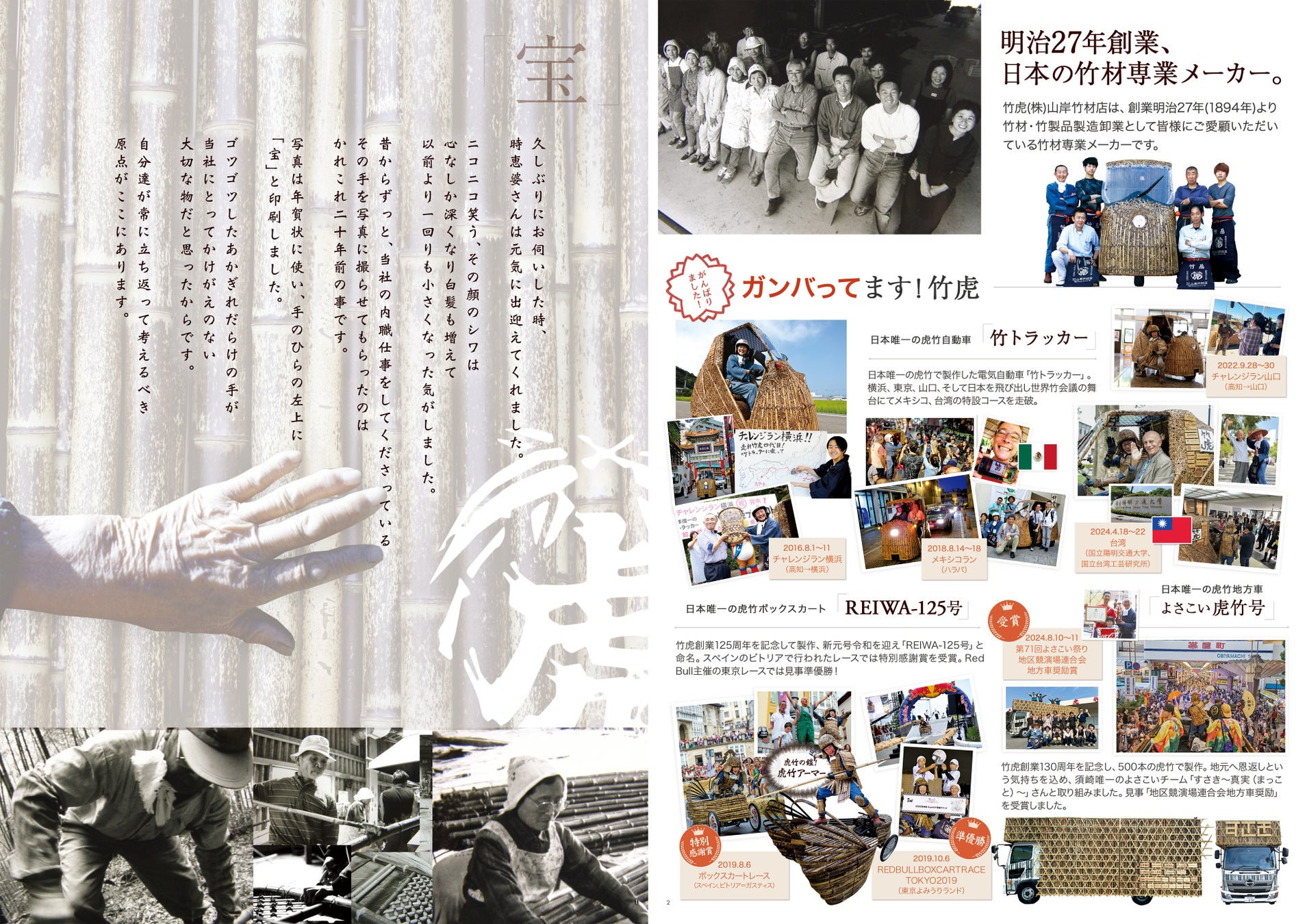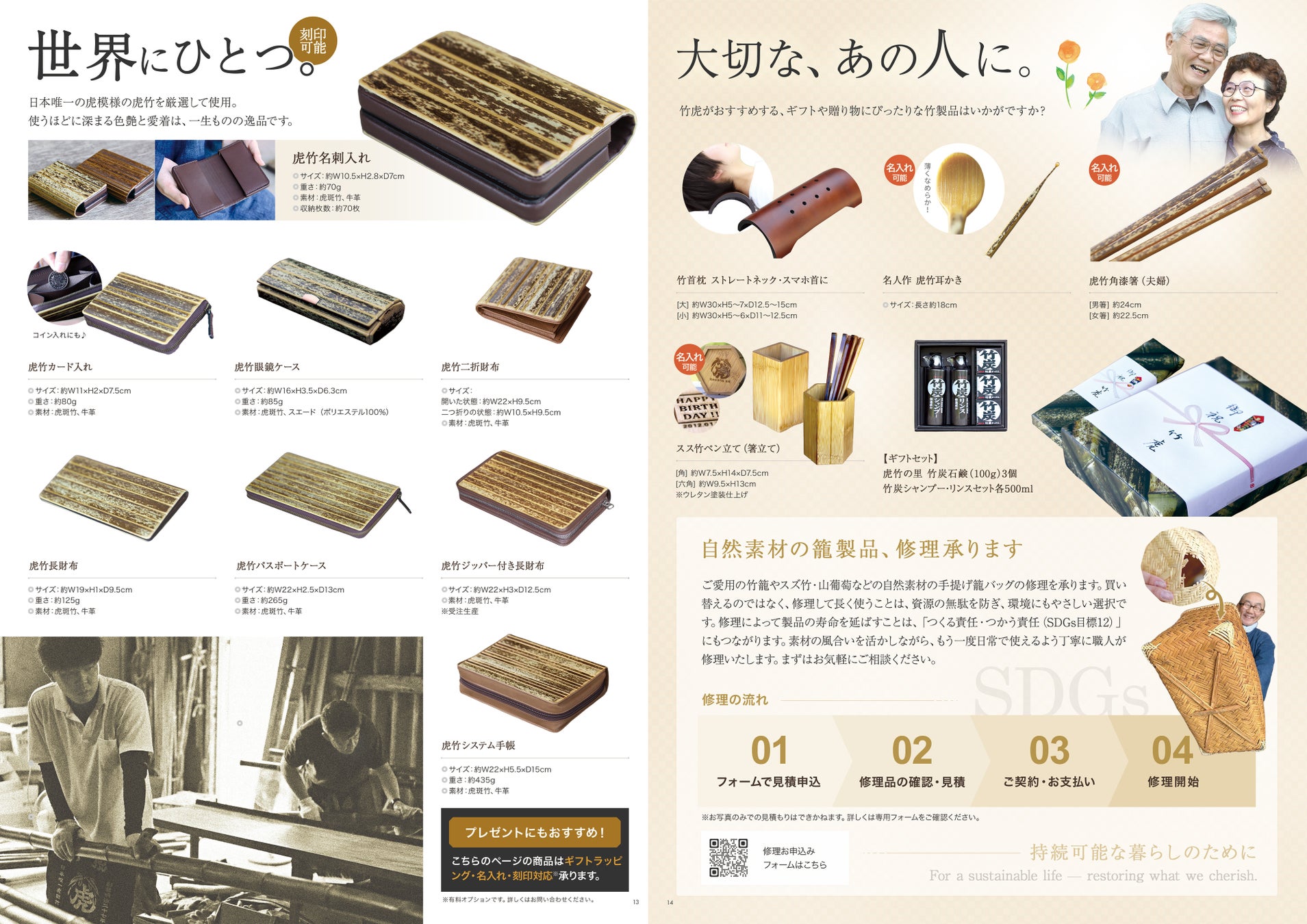 カタログをリニューアルし、虎竹文化と竹製品の魅力が詰まった1冊が出来上がりました。定番商品に加え新商品も掲載し、継続利用可能な天然素材である竹を使用した多彩な製品がご覧いただけます。