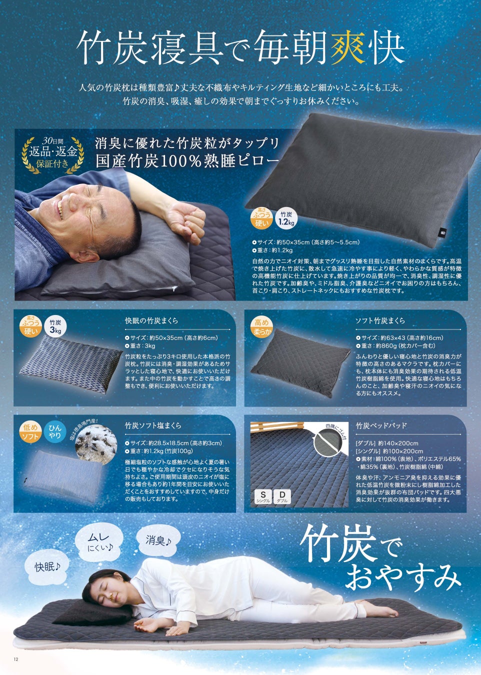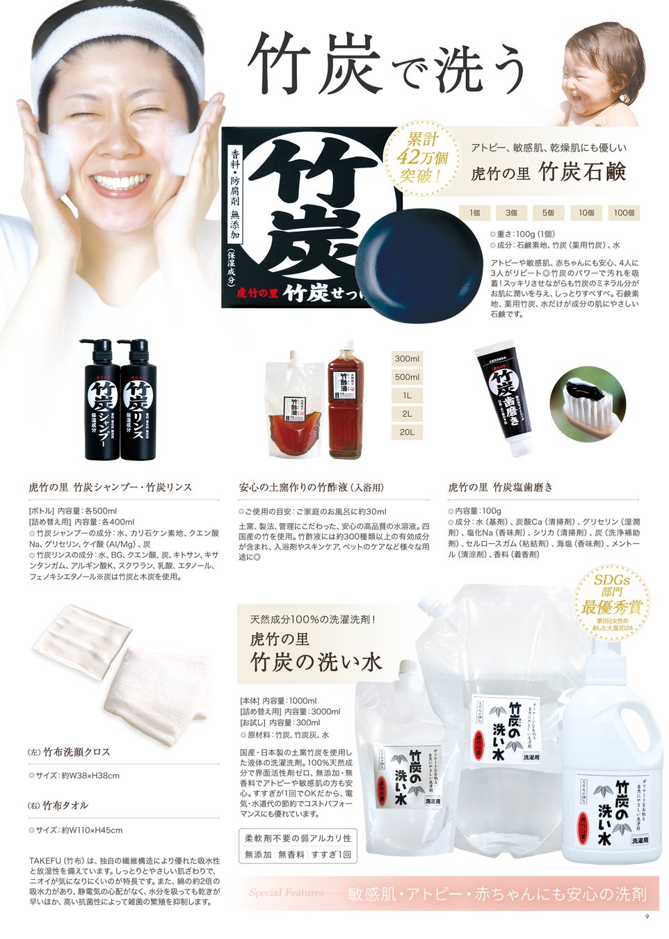 また、ロングセラー商品である「虎竹の里 竹炭石鹸」や「竹炭の洗い水」、さらに「国産竹炭100%熟睡ピロー」など、暮らしを快適にする竹炭アイテムも充実。竹炭の持つ独自の機能と、竹虎のものづくりへのこだわりを、ビジュアルと共にわかりやすく解説しています。