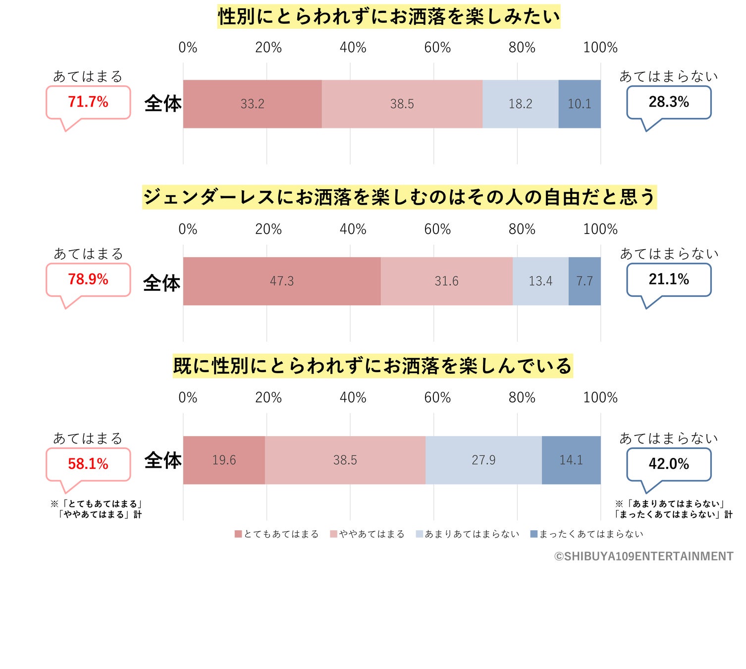 ジェンダーとファッションに関して「性別にとらわれずにオシャレを楽しみたい」と回答したのは71.7%、「ジェンダーレスにおしゃれを楽しむのはその人の自由だと思う」という回答が78.9%、「すでに性別にとらわれずにオシャレを楽しんでいる」※図3という回答が58.1%になりました。