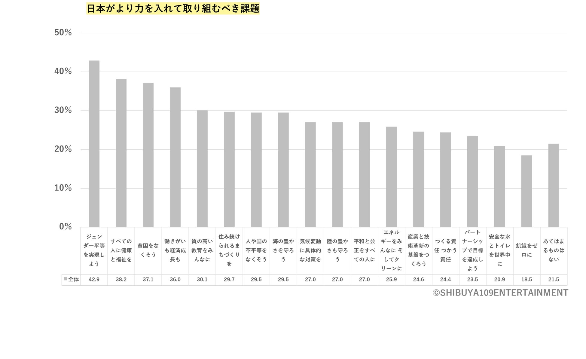 一般にZ世代はジェンダーに関する課題への関心が高いとされていますが、2020年にSHIBUYA109 lab. がZ世代を対象に実施したSDGsに関する調査において、 SDGsにおける17の目標のうち、日本がより力を入れて取り組むべきだと思う目標は「ジェンダー平等を実現しよう」が第1位となっています。
