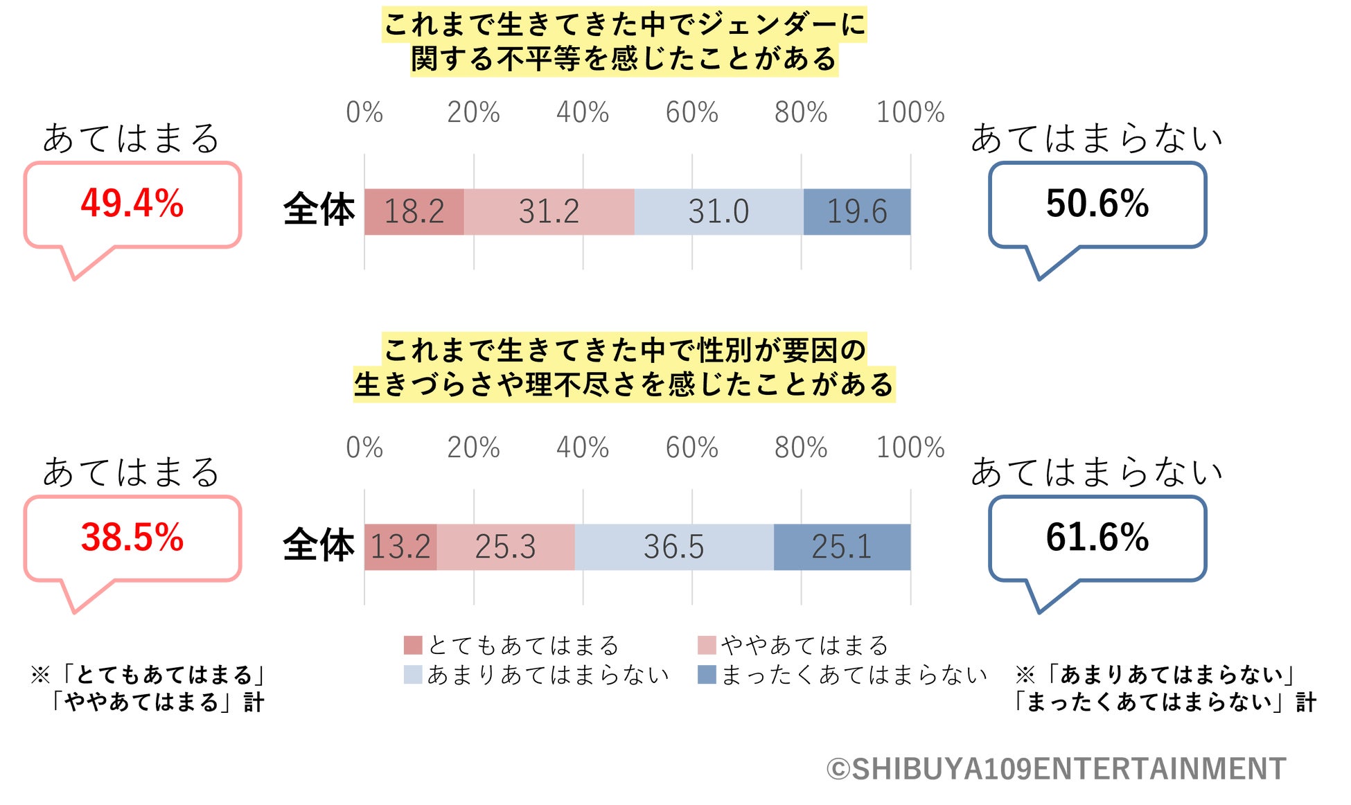 「これまで生きてきた中でジェンダーに関する不平等を感じたことがある」には49.4%が、「これまで生きてきた中で性別が要因の生きづらさや理不尽さを感じたことがある」という設問には38.5%の方が「とてもあてはまる」「ややあてはまる」を選択しました。