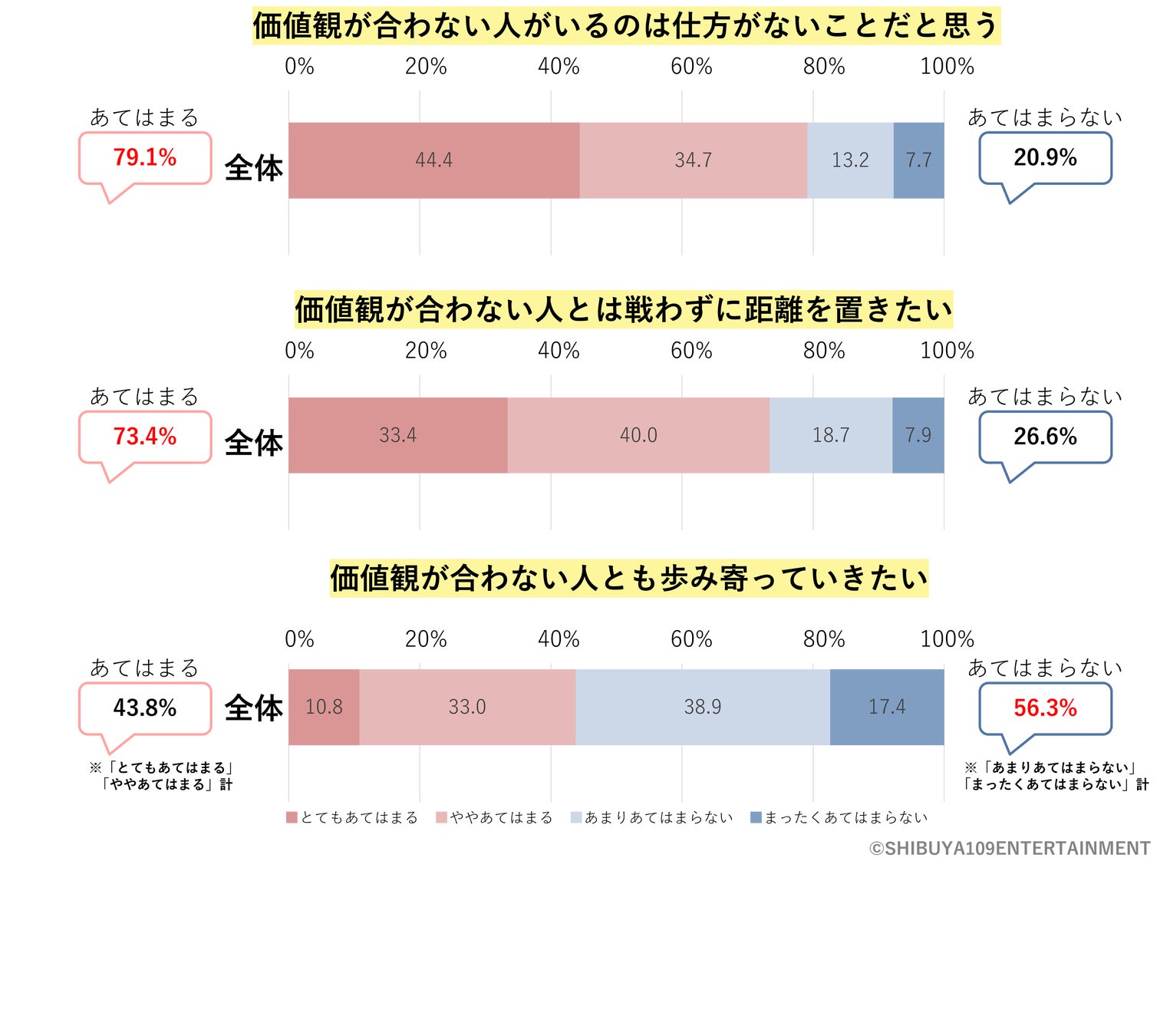 インタビューでは「考え方が違う人がいるのは仕方がないと思うので、各々が楽しく過ごせれば良いかなと思う」など、異なる価値観を持つ人に対して、距離を取ることで衝突を避ける傾向にあることがわかりました。