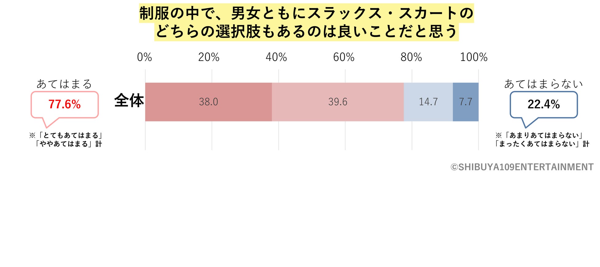 学校制服に関して、「制服の中で、男女ともにスラックス・スカートどちらの選択肢もあるのは良いことだと思う」※図5と回答したのは77.6%となり、実情を調査した質問でも学生生活において、「女子生徒もスラックスの選択肢がある」のは50.5%、「スラックスを着用している女子生徒がいる」※図6のは44.6%となりました。
