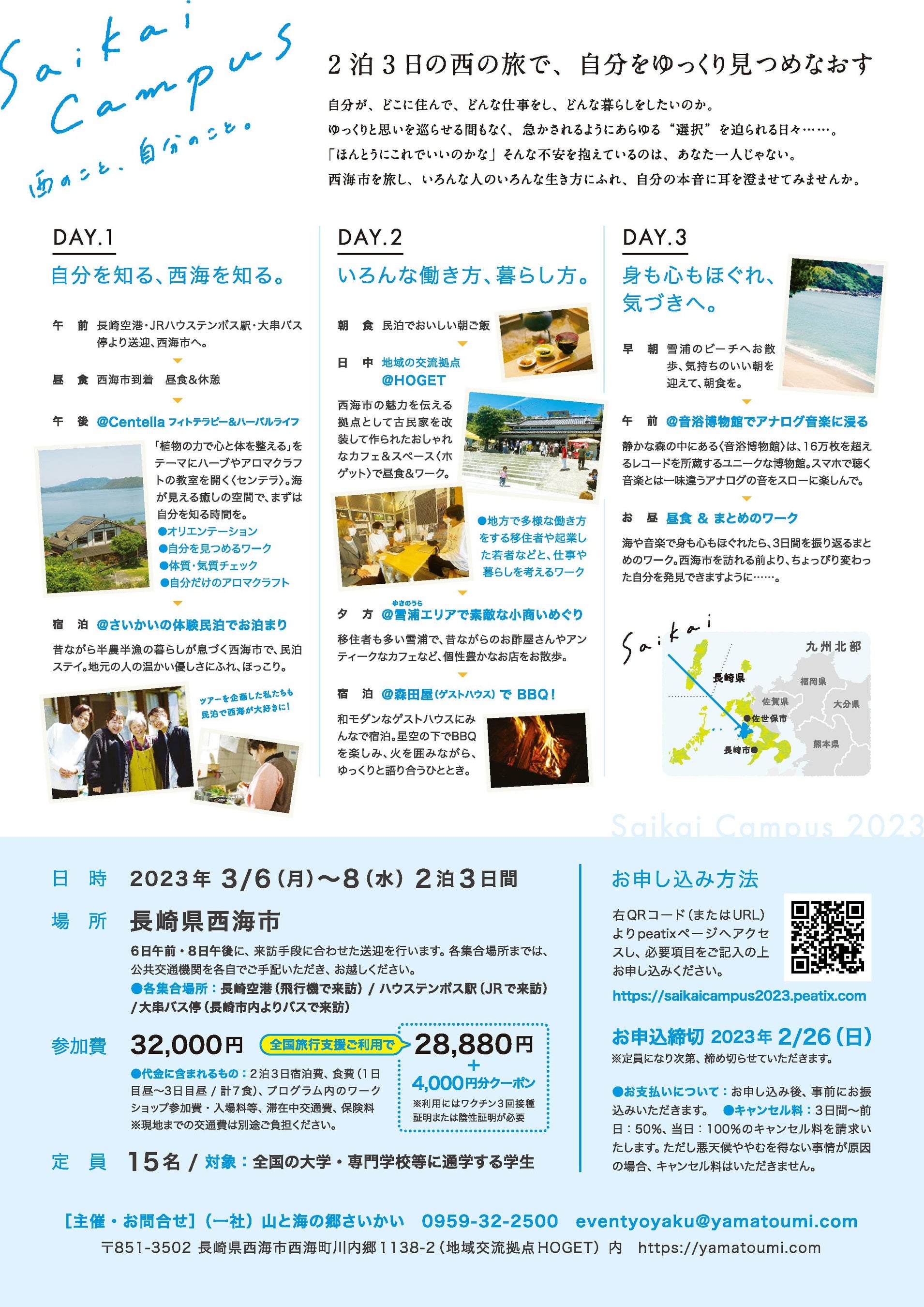 ツアーは3月6日~8日の3日間の行程で、1日目は「自分を知る、西海を知る」をテーマに、移住者が運営する海に面した店舗でアロマグッズづくりのワークショップを行い、この日は民泊。2日目は「いろんな働き方、暮らし方」をテーマに、地域の交流拠点で、移住者や起業した若者と交流し、多様な働き方や暮らし方について考えます。最終日となる3日目は「身も心もほぐれ、気づきへ」と導く、海辺の散策や博物館での音楽鑑賞、最後のまとめワークを予定しています。