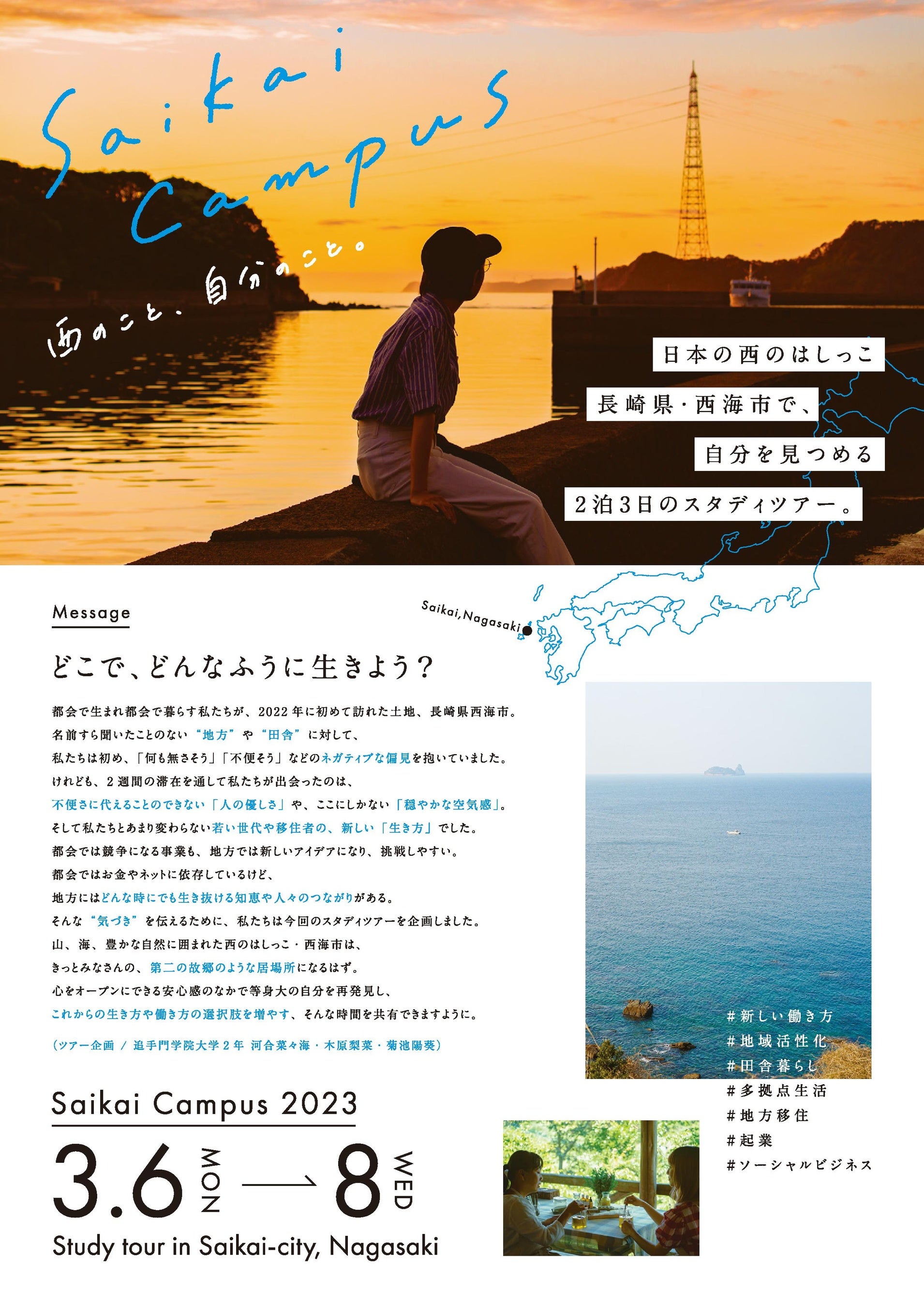 学生らは昨年3月、九州の西端に位置し、豊かな自然が息づく西海市で民泊事業を行う「一般社団法人山と海の郷さいかい」で教育旅行を開発するステイ型のインターンシップに取り組みました。 2週間の滞在の中で、同市が誘致に取り組んでいるUIJターンした起業家や住民との出会いから、不便さに代えることのできない「人の優しさ」と「穏やかな空気感」、若い世代の移住者による「新しい生き方」に触れ、この気づきを全国の学生に体験してもらおうとツアーを企画しました。