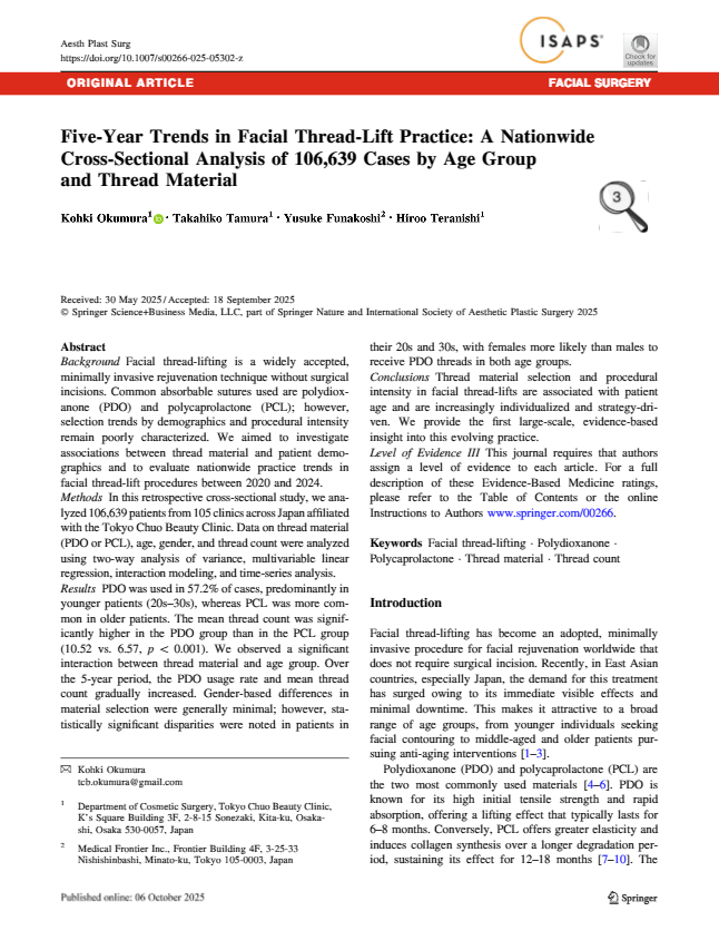 論文タイトル:Five-Year Trends in Facial Thread-Lift Practice: A Nationwide Cross-Sectional Analysis of 106,639 Cases by Age Group and Thread Material