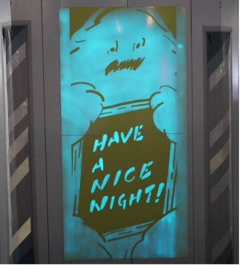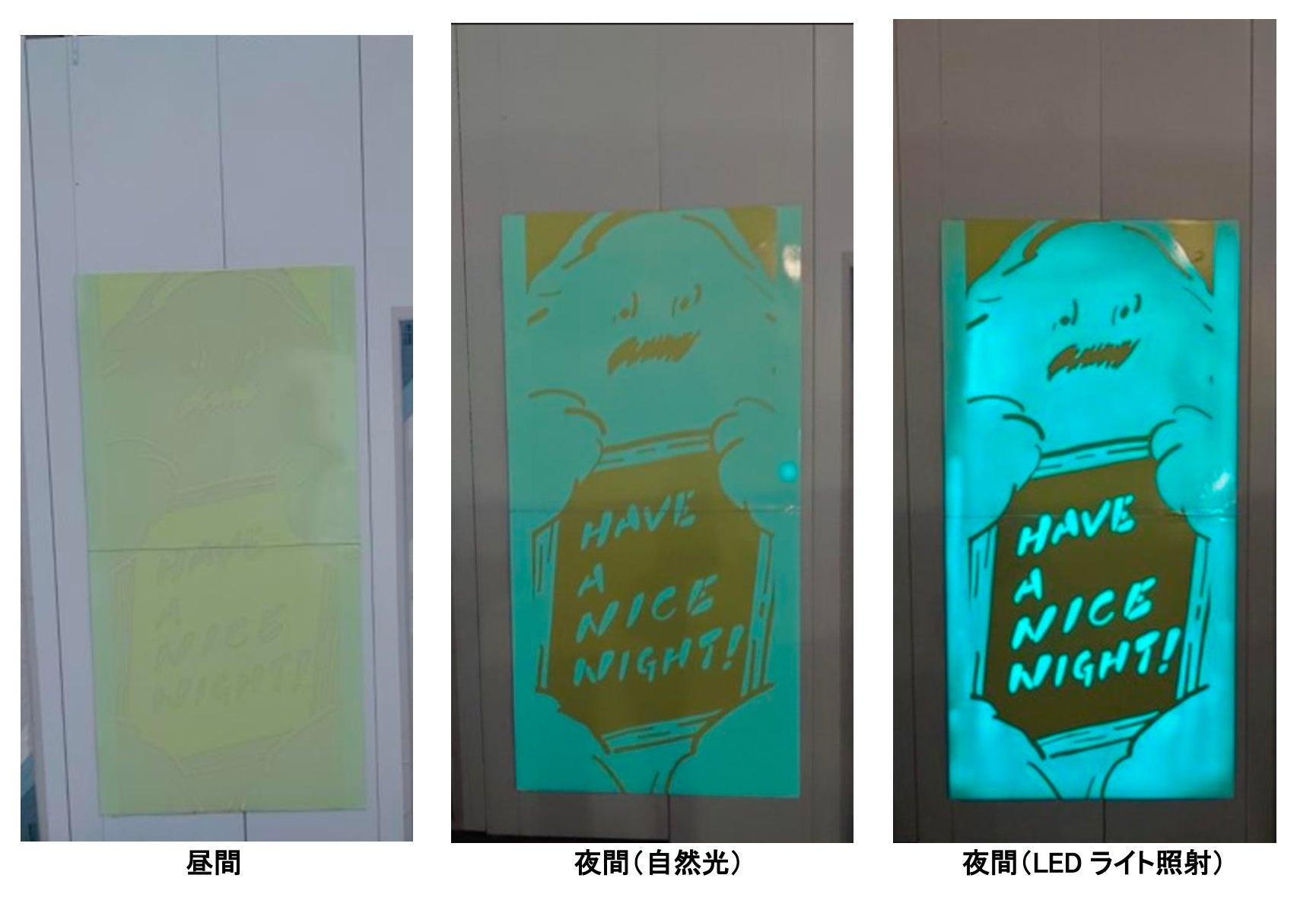 昼間は壁と同じデザインで目立たず、夜間には空間演出によりアートが鮮やかに浮かび上がる。