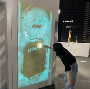 LEDライトやブラックライトを当てると、よりデザインの存在感を際立たせることも可能です。通行人の方はご自身でライトを当ててデザインを浮きださせ、写真を撮影される方も複数いらっしゃいました。