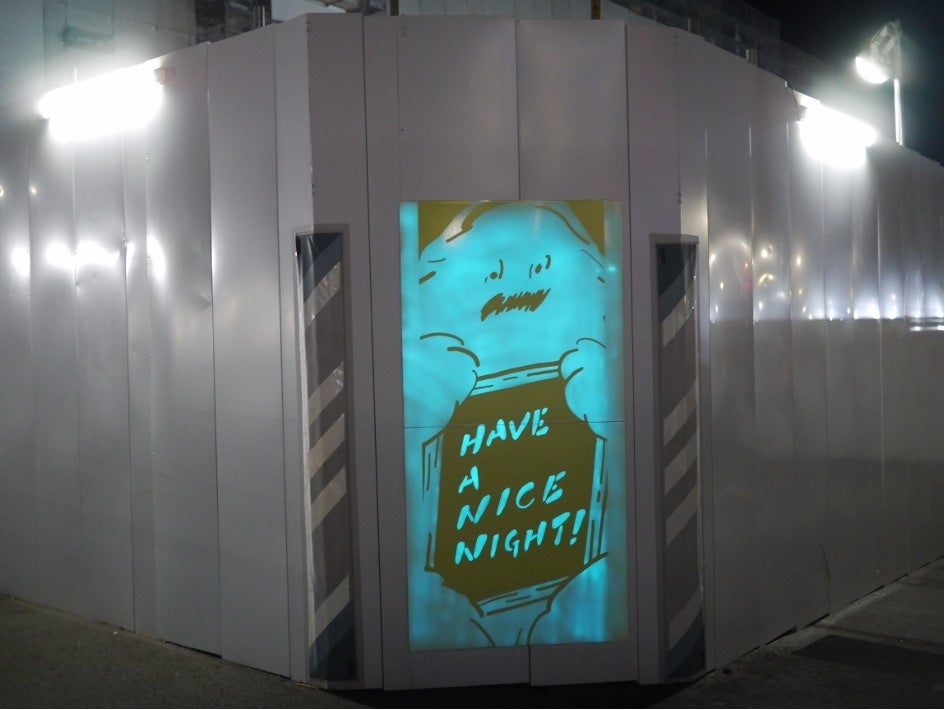 電力を使わずに自然光で蓄えたエネルギーで夜間に発光することで、工事現場が魅力的なアートスペースに変身。ライトで発光を強められる仕掛けにより、通行者も参加できる新たな空間演出の選択肢