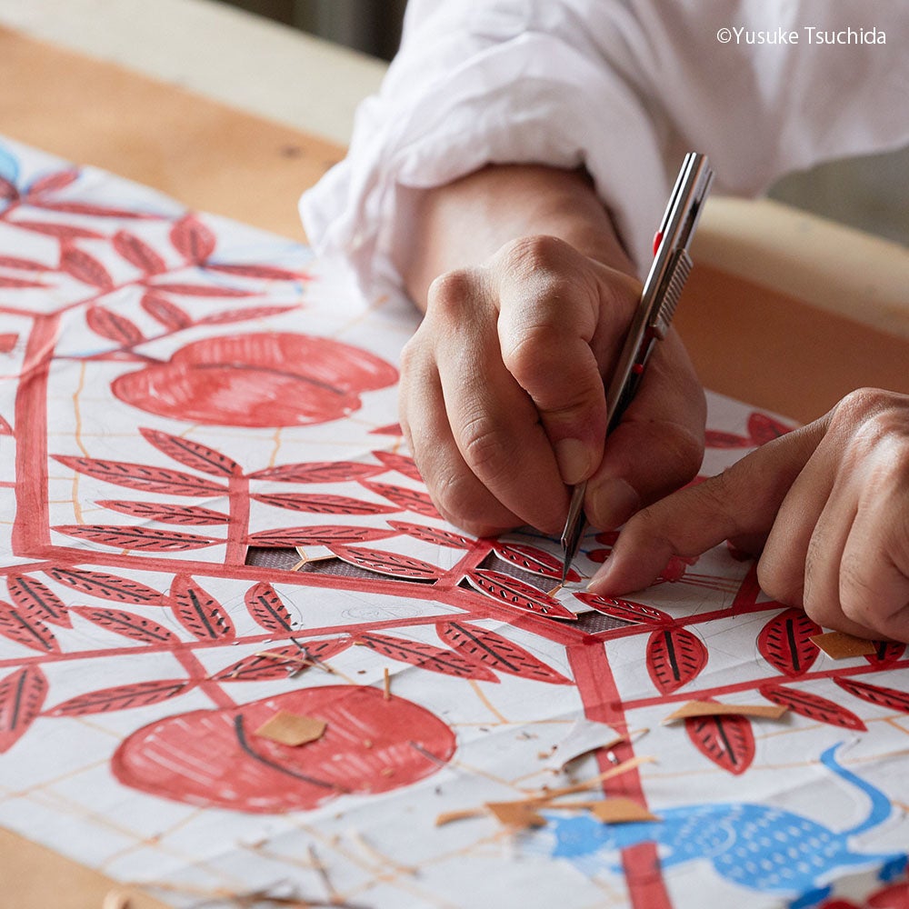 本展では、SFTでも人気の高い注染手ぬぐい(*)を、普段は見ることのできない製品になる前のロールのままダイナミックに展示。実際にアトリエで使用している道具などと共に制作工程を学びながら様々な作品をご覧いただけます。