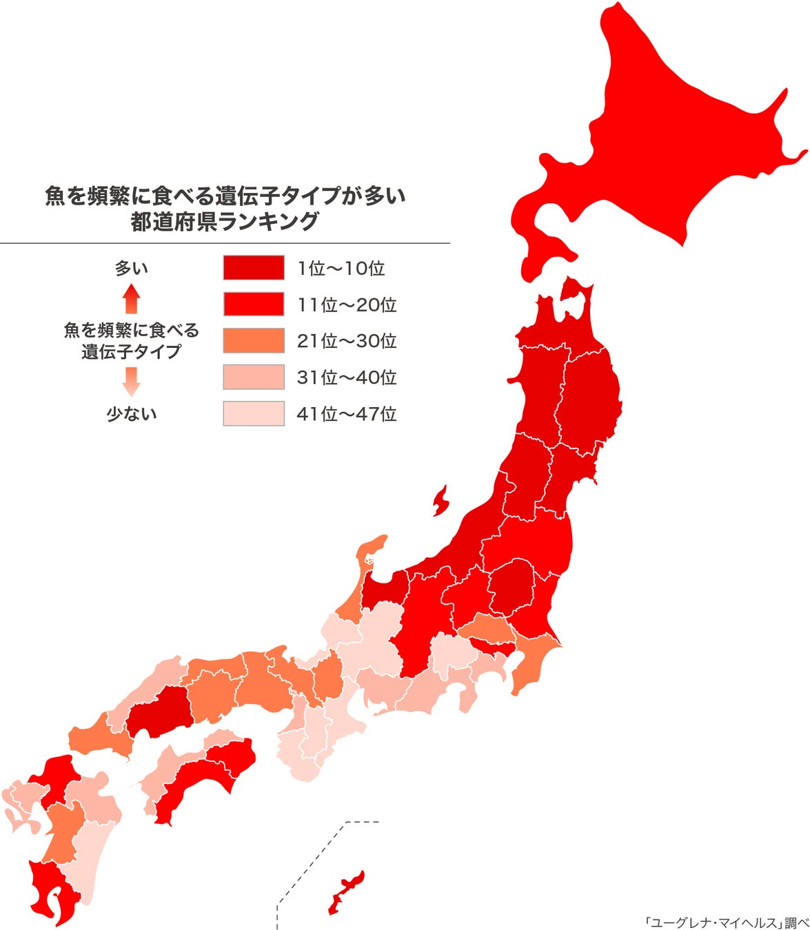 この度、ユーグレナ・マイヘルスとジーンクエストの遺伝子解析サービスの利用者の中から20,000人以上のゲノムデータを用いて、「魚の摂取頻度(SNP:rs11066015)」という項目を解析しました。遺伝子解析項目「魚の摂取頻度」は、魚を食べる頻度に対する、遺伝子型の影響を示す項目で、「魚の摂取頻度が一般的なタイプ(遺伝子型:GG)」、「魚の摂取頻度がやや低いタイプ(遺伝子型:AG)」、「魚の摂取頻度が低いタイプ(遺伝子型:AA)」の3つのタイプがあります。今回の調査では、この遺伝子(SNP:rs11066015)の型のなかで、相対的に魚の摂取頻度が高いと想定される遺伝子型「魚の摂取頻度が一般的なタイプ(遺伝子型:GG)」に該当する人の推定割合を都道府県別に算出し、数値化しました。