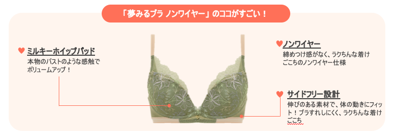 本物のバストのような感触のミルキーホイップパッドで、ボリュームアップ。サイドは、伸縮性のある素材で身体にフィットし、ブラズレしにくくラクちんな着け心地。「ラクちんボリュームアップ」で人気の「夢みるブラ」のノンワイヤーバージョン。カップ下のパワーネット素材でカップを立体的にキープし、ノンワイヤーなのに、きれいなバストシルエットが叶います。