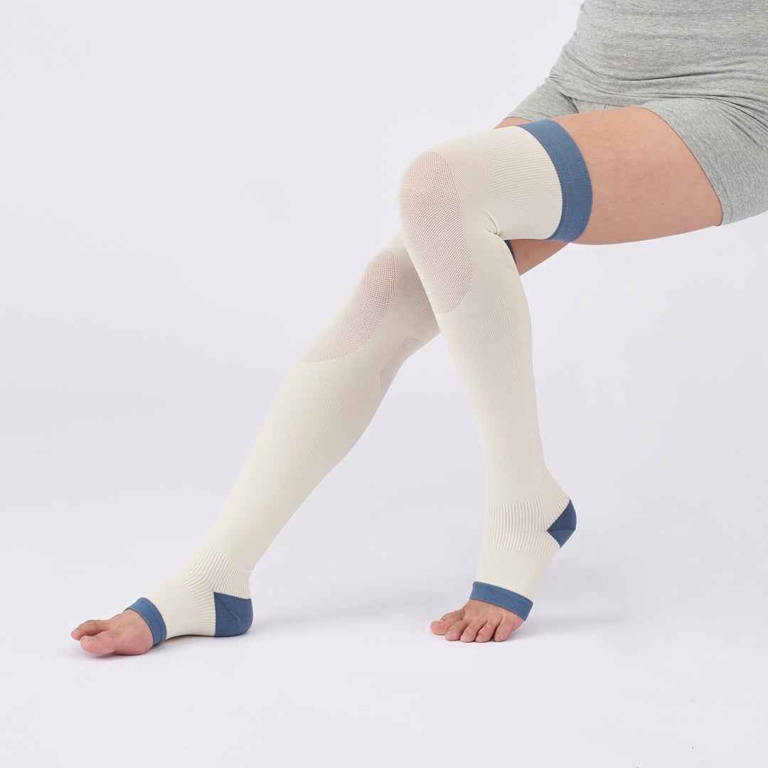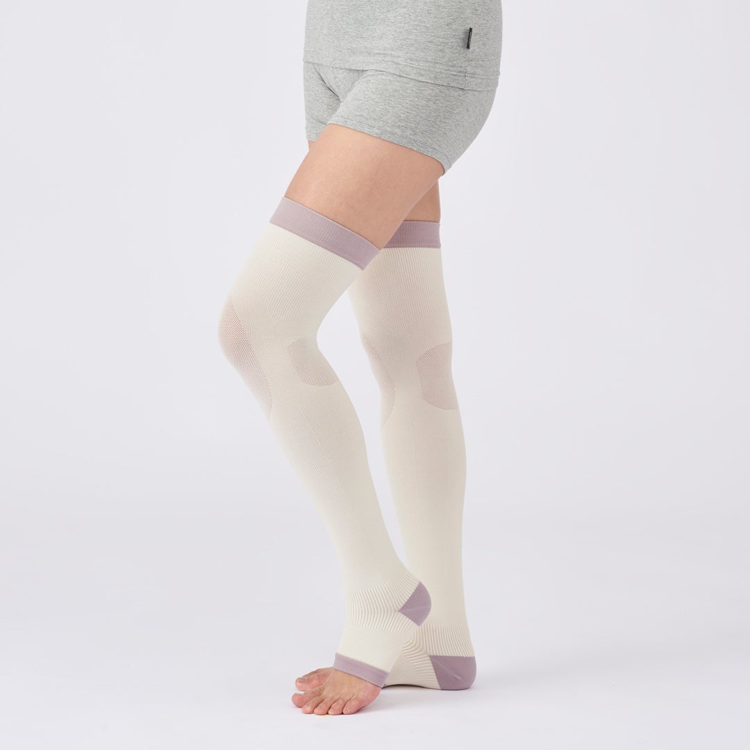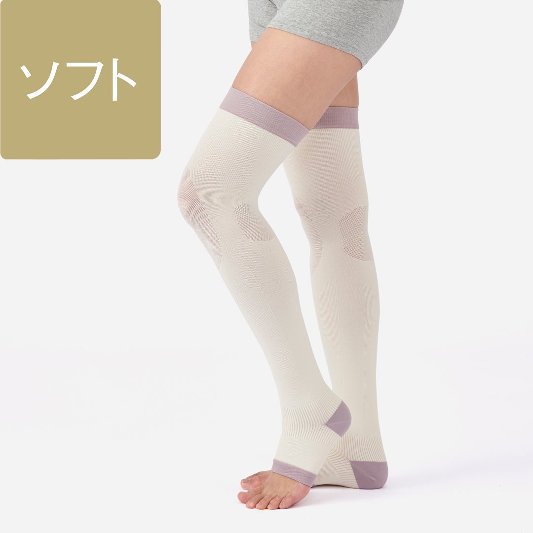 着圧ソックスの「脱ぎ履きが大変」という悩みに着目したアイテム。スクワラン加工を施したなめらかなナイロン生地を使用し、脱ぎ履きのしやすさにこだわりました。膝部分はメッシュ生地に切り替えることで、曲げ伸ばししやすいだけでなく、ムレにくく快適です。着圧強度別にハードとソフトがあり、毎日の体調に合わせて使い分けができます。強めの着圧でしっかり引き締めたい日はハードを、ソフトな履き心地で優しくケアしたい日はソフトがおすすめです。