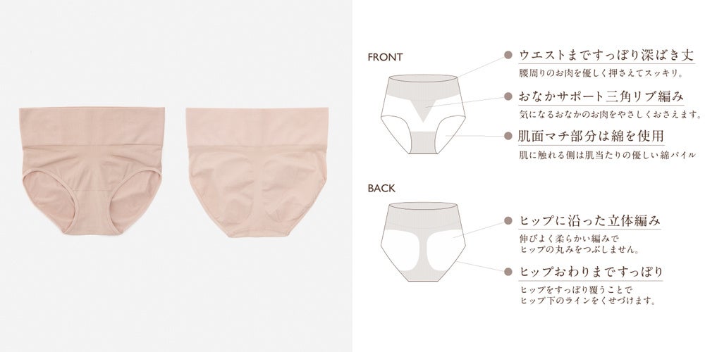 編地の強度を変えた立体成型編みで、スタイルをケアするショーツ。おなか周りを引き締め、ヒップを包み込むことで型崩れをケアします。なめらかなはき心地で伸びが良く、肌に触れるマチ部分は綿パイルのため、ムレにくく快適です。毎日のショーツとして、ガードル未満でボディラインを整えたい方におすすめです。
