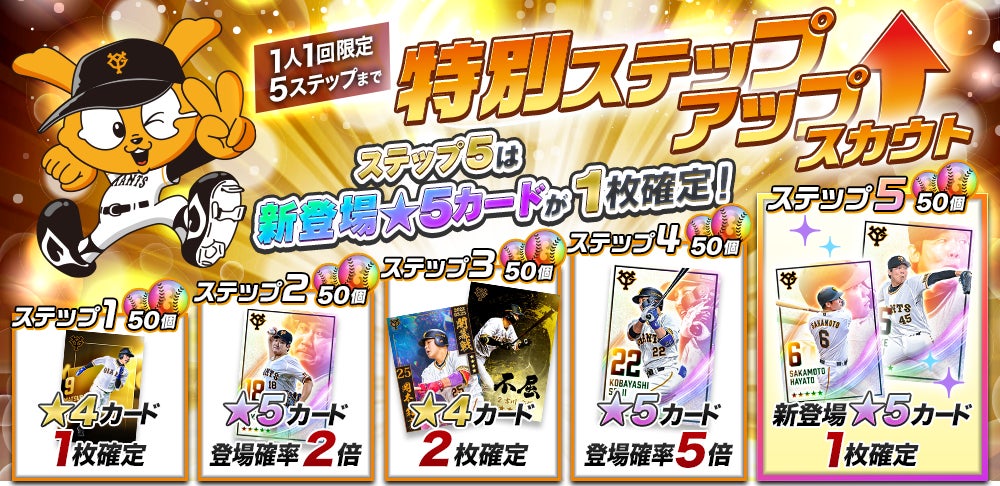 5ステップ目には新登場の坂本選手、畠投手どちらかの★5カードが1枚確定となる特別なスカウトです。