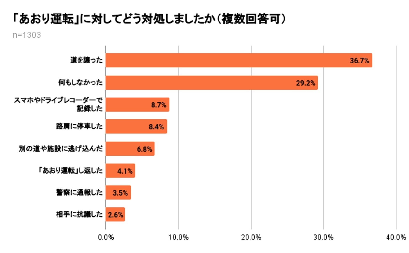 ・「家族を乗せて運転していた際、合流車線から来た車がこちらを見ずに合流してきたため、急ブレーキと急ハンドルでかわした。家族にも幸い怪我はなく、クラクションを鳴らしたものの、こちらを気にする素振りもなく走行していたため、頭に血が上りあおり運転をしてしまった」(富山県、30代男性)